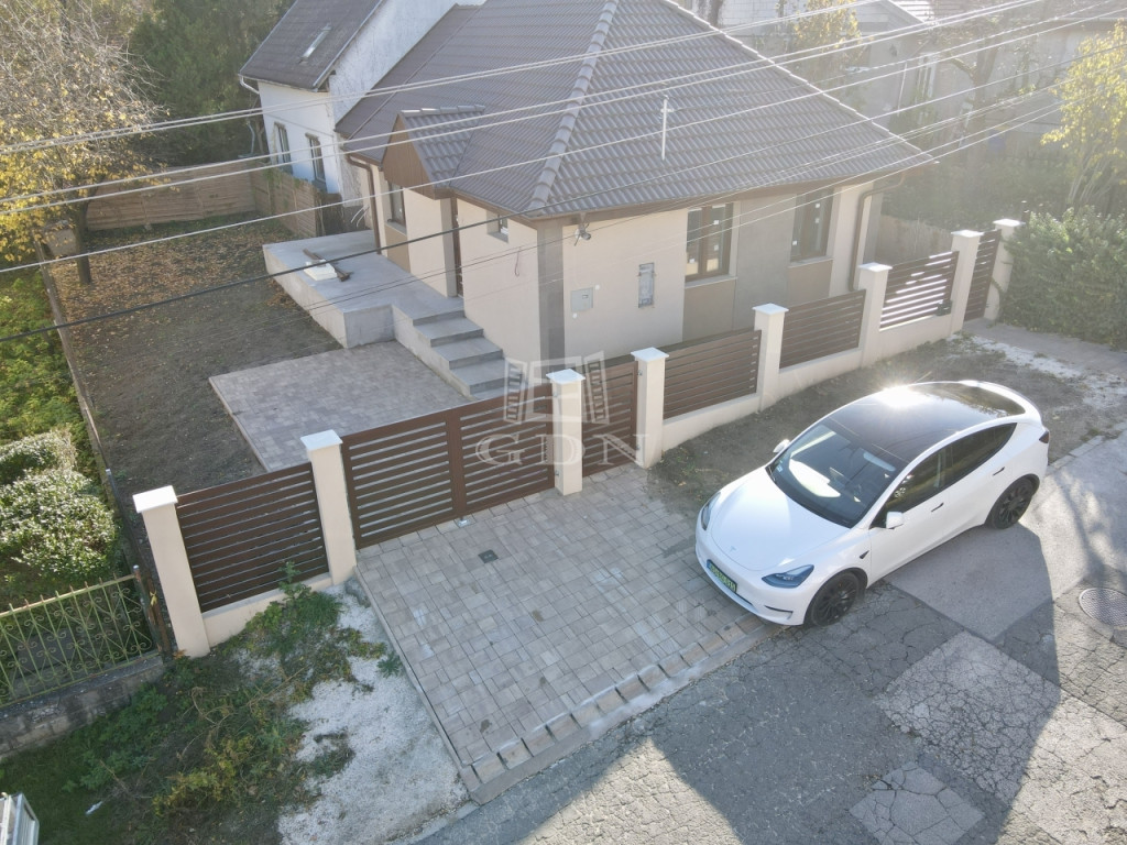 A térkövezett járda és autóbeálló, elektromos kapu, valamint a modern, letisztult kerítés tovább emeli a ház kényelmét és esztétikáját.