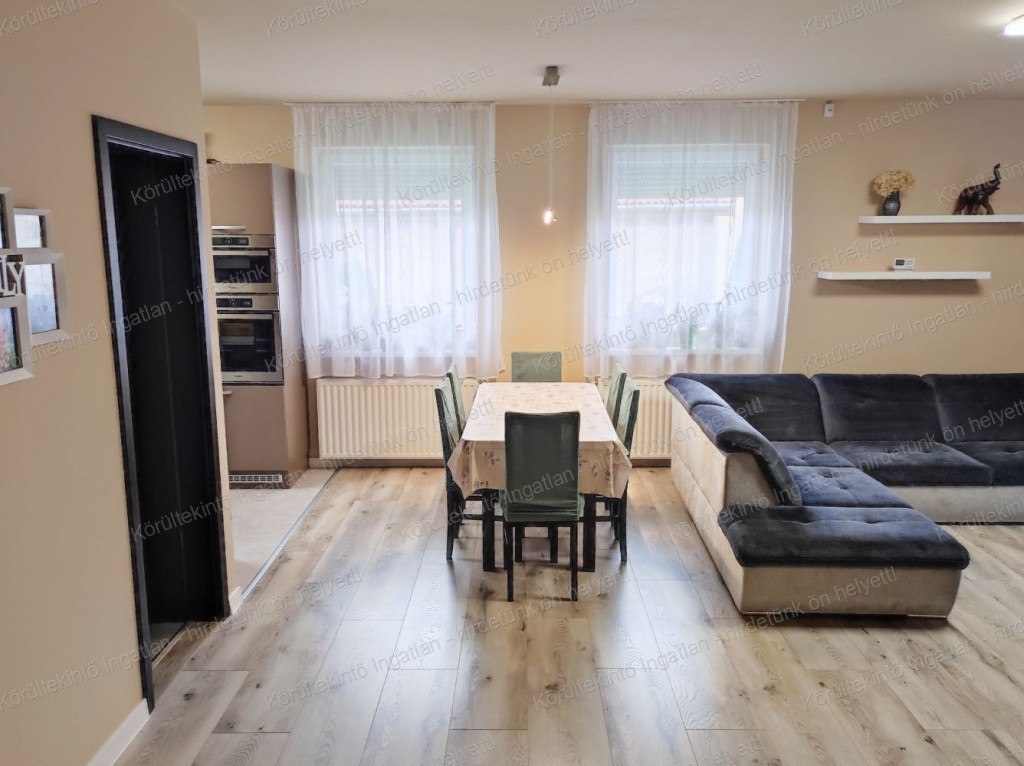 - tágas, amerikai konyhás nappali étkezővel, a konyhabútor modern, beépített inox Whirpool gépekkel felszerelt, és kamra is kapcsolódik hozzá.