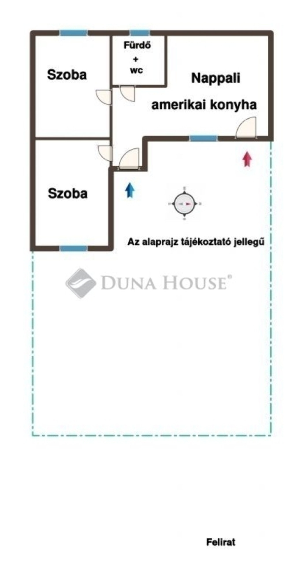 Nappali amerikai konyha + két szoba elrendezésű, tégla építésű.