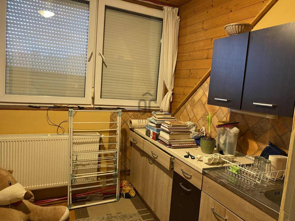 A második szintre feljutva jobbra a fürdőszoba van wc-vel, továbbhaladva fa konyhabútorral beépített amerika konyha található kis kamrával, valamint nappali hálószobával.