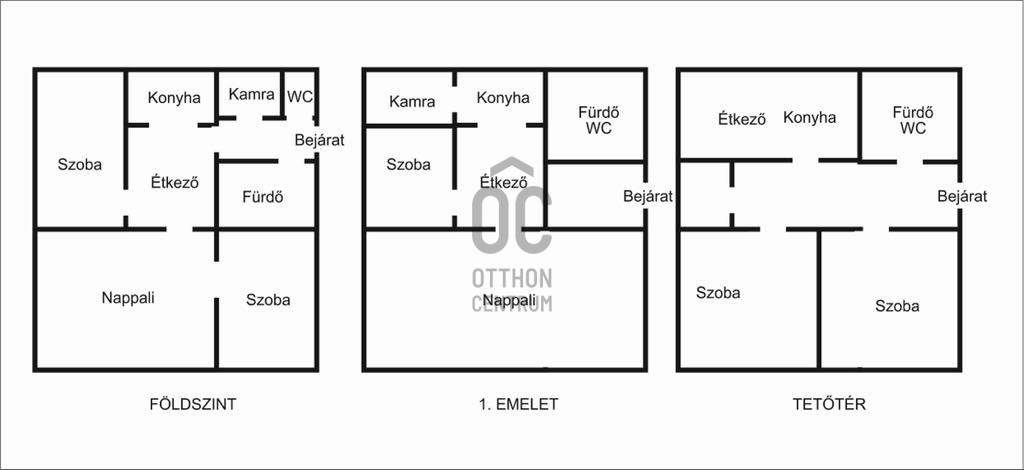 A harmadik szinten, a tetőtérben fürdőszoba, két hálószoba van egy főzőfülkével.