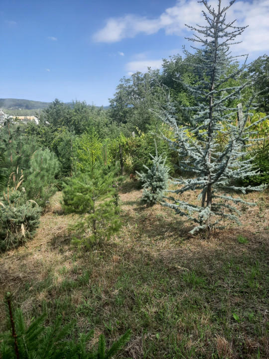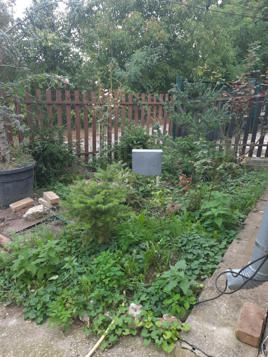 A ház előtt kis előkert, míg mögötte tároló és pince , valamint egy különleges fenyőkkel beültetett keskeny hátsó kert található ahonnan csodás panoráma nyílik .