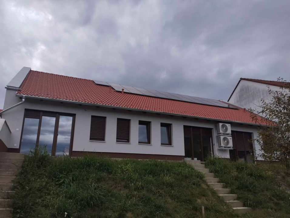A napelemes rendszer 9,5 kW, lakásonként 15 db 360 W Monokristályos napelemből áll. A tégla építésű ingatlan 10 cm- es grafit szigetelést kapott.