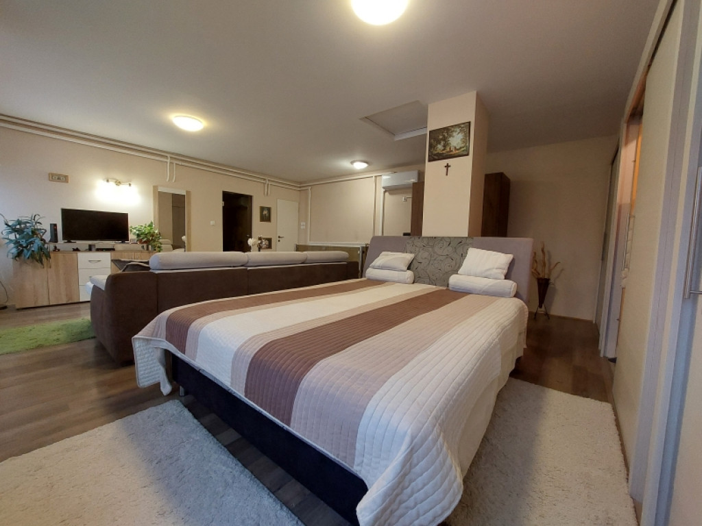 A házban két nagyméretű, külön nyíló szoba található (19 m² és 31 m²), utóbbi igény szerint egyszerűen kettéosztható, így akár három szoba is kialakítható. A lakótérhez egy kádas fürdőszoba, két különálló WC, valamint az emeleten egy egyedileg gyártott, minőségi gardrób kapcsolódik. Kiemelkedő értéke az emeleti, 36 m²-es, panorámás terasz, ahonnan páratlan kilátás nyílik a Mecsek déli lankáira. Az ingatlanhoz tartozik továbbá egy 13 m²-es, gondozott pince, valamint egy 3,5 m²-es tároló.