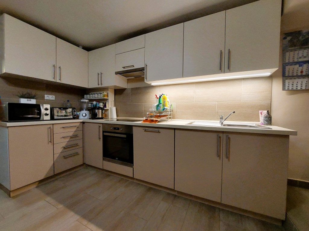 A modern otthon része egy egyedileg tervezett, beépített, teljesen gépesített konyhabútor, amely főzőlappal, sütővel és mosogatógéppel felszerelt, így azonnal használatra kész.