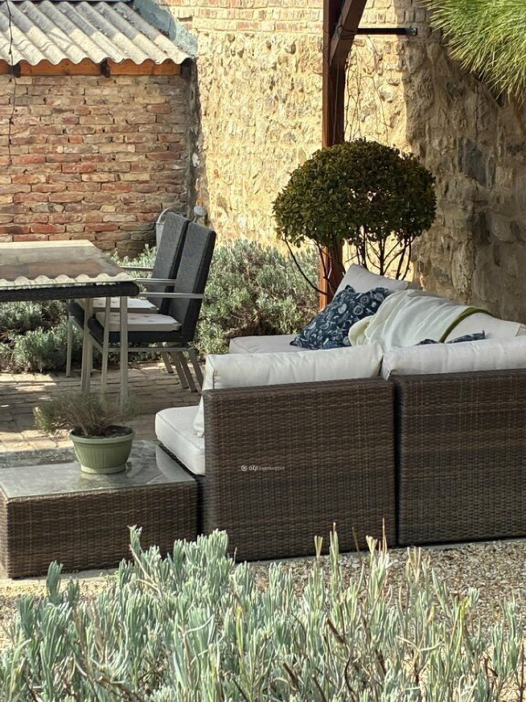 A 372 nm-es telken hangulatos, napfényes udvar található. Az ingatlan egy 23 nm-es apartmanból és egy 60 nm-es lakásból áll (két szoba, konyha-étkező, fürdő, külön WC, tároló, pince), amelyek igény szerint egybenyithatók.