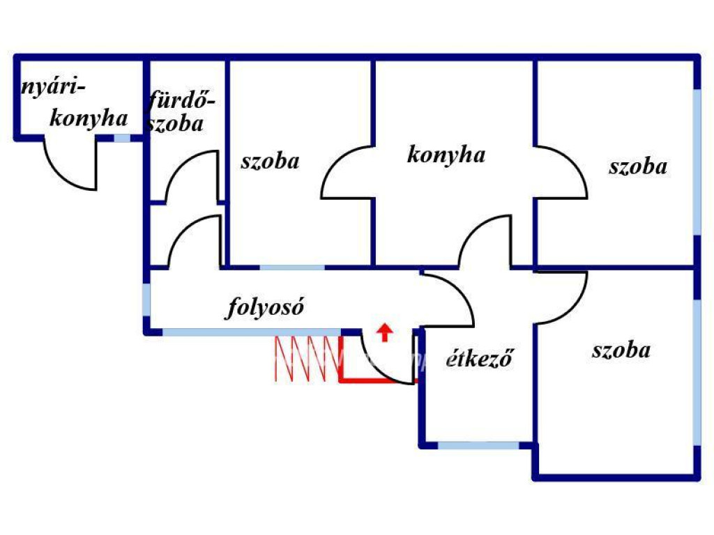 A lakóépületben 2 tágas, napfényes, keleti tájolású és egy kisebb szoba, étkező, fürdőszoba, világos előszoba található.