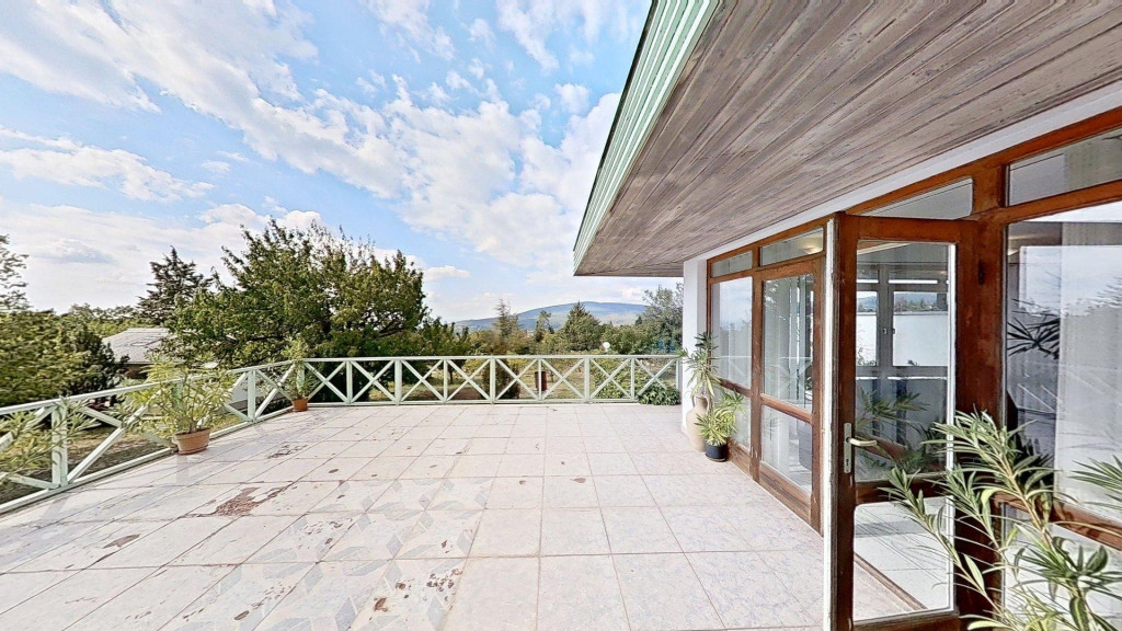 A középső, utcafrontról is nyíló, de a kertből két oldalról is megközelíthető szinten található a csodás panorámát nyújtó, 60nm-es, kertre és a hegyekre néző terasz. Innen jó időben nem csak a Jakab-hegyet, de a horvát hegységeket is látni. A terasz felé két oldallal is nagy üvegfelületekkel kapcsolódó, 22nm-es nappaliból hasonlóan szép panoráma élvezhető. Innen egy légtérben, de jól elszeparálva egy 5 m²-es kis dolgozósarok, valamint egy 20 m²-es étkező egy található. Mellette kapott helyet a 13 m²-es konyha, melynek saját kijárata van a teraszra, és a terasz felőli fala szintén hatalmas üvegfelületekkel rendelkezik. A szinten található továbbá egy 5 m²-es fürdőszoba zuhanykabinnal, mosdóval és WC-vel. A főbejárat mellett kamra, valamint innen nyílik a 25 m²-es garázs is.