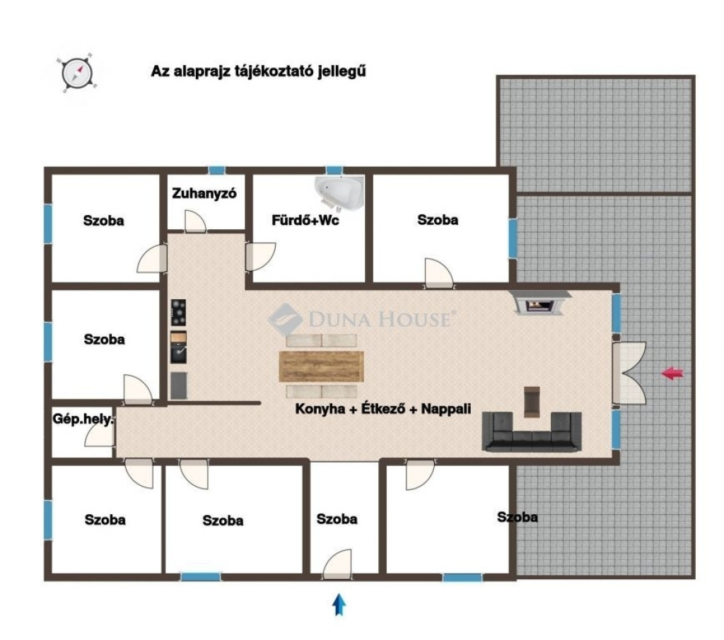 Teraszok: 42 m²-es fedett terasz a reggeli kávéhoz + külön nyári sütögető és bográcsozó hely a baráti társaságnak.