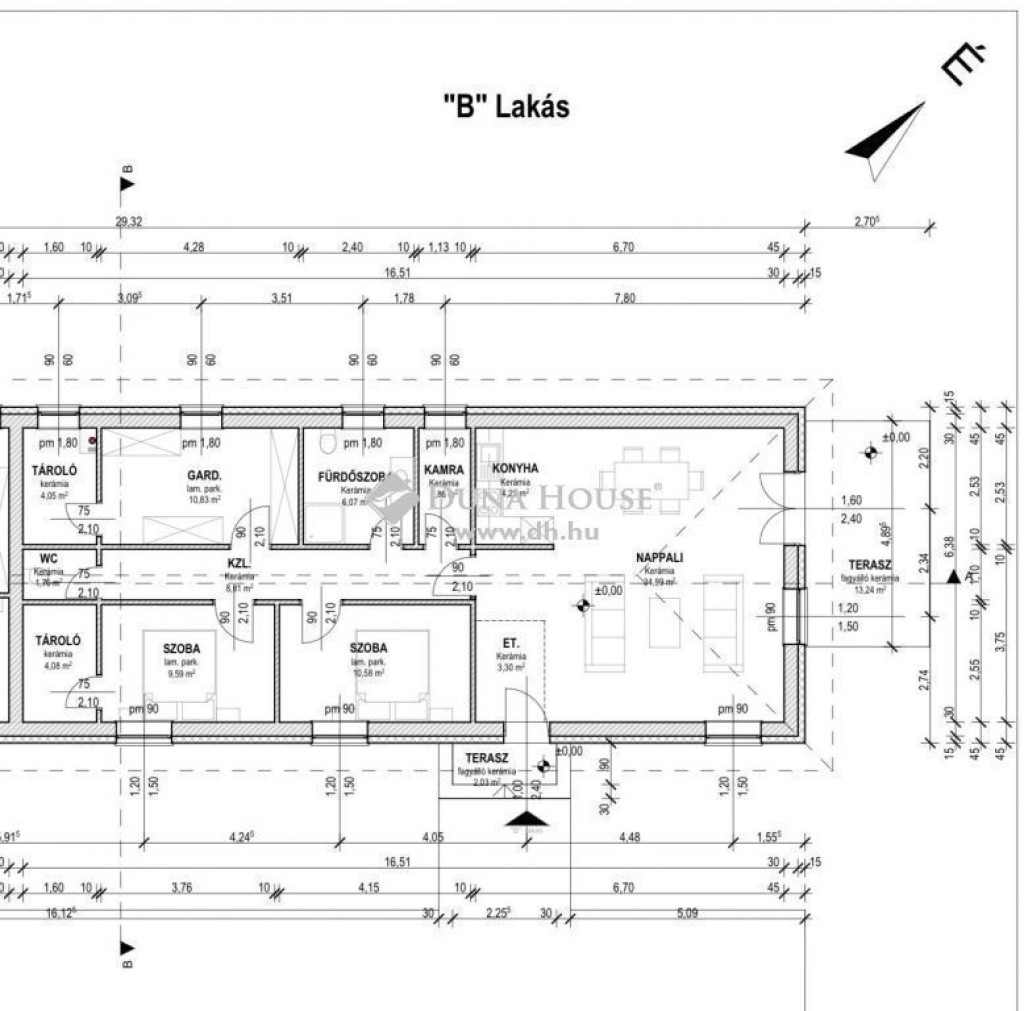 Kialakítása: 2 szoba, tágas 40 m2-es amerikai nappali konyha, kamra, fürdő+wc, külön wc, gardrób, 2 tároló.