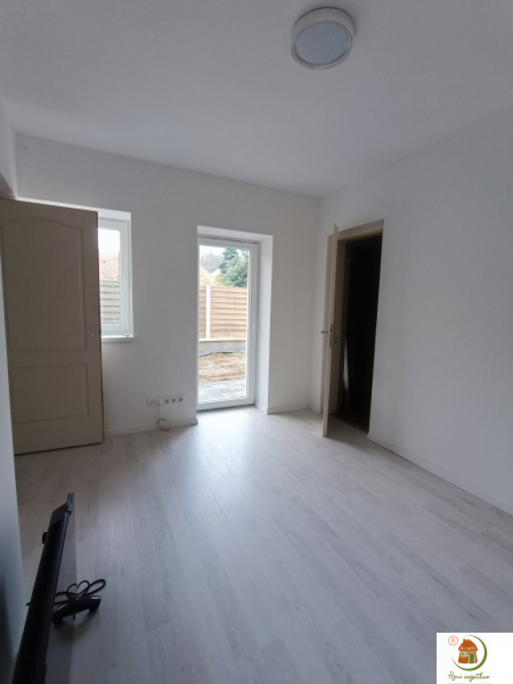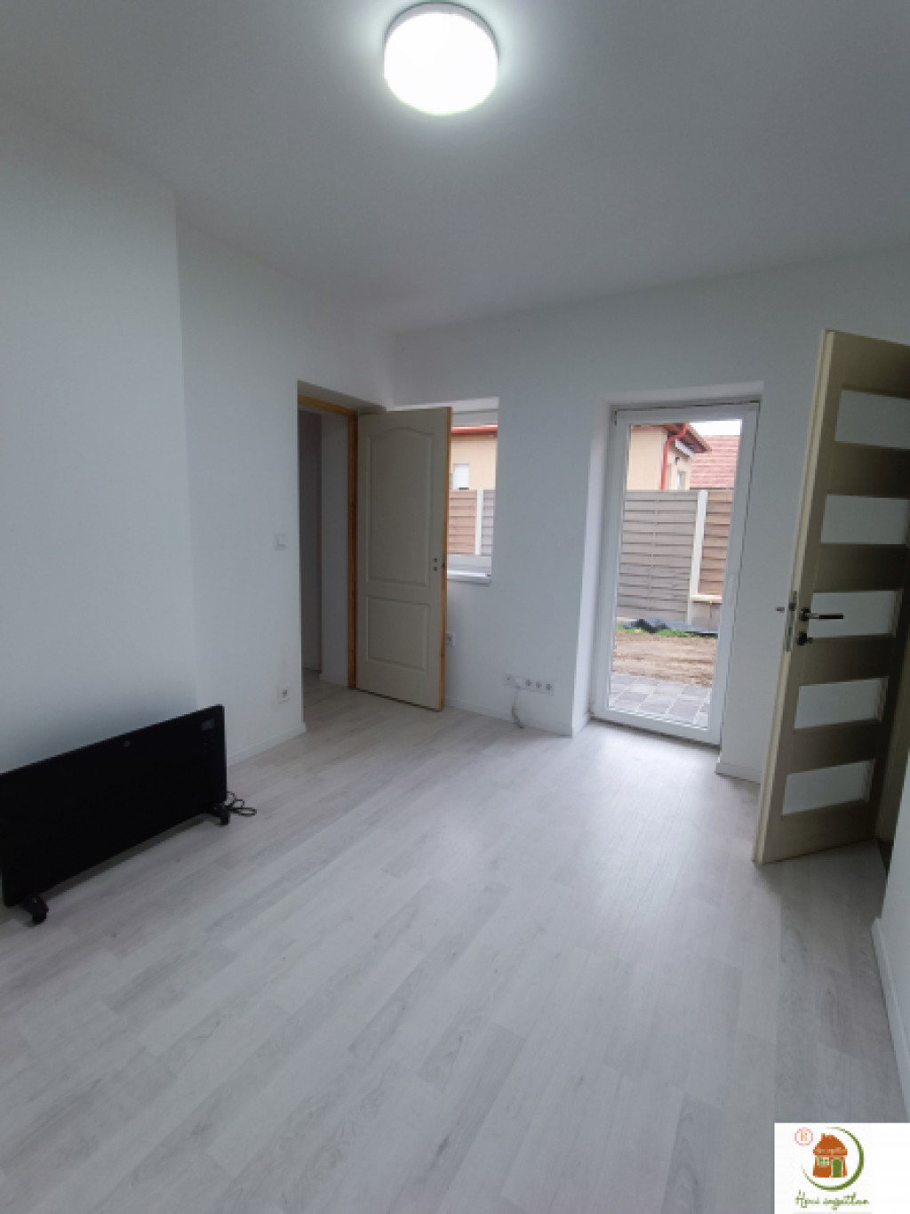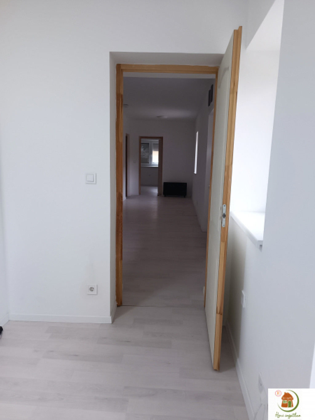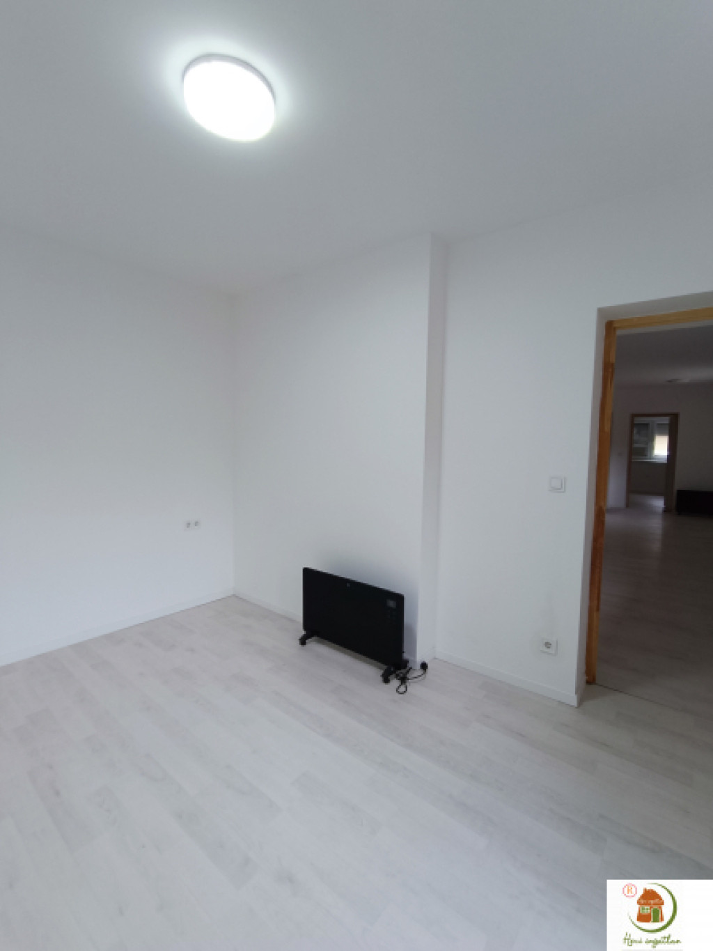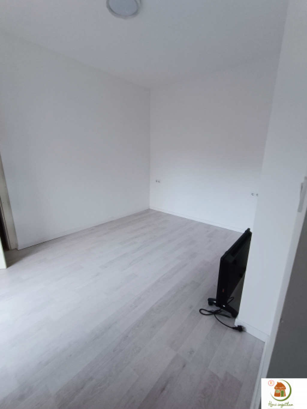 Korszerű, tetszetős világítás, elegáns szürkésfehér laminált parketta, törtfehér színű falak.