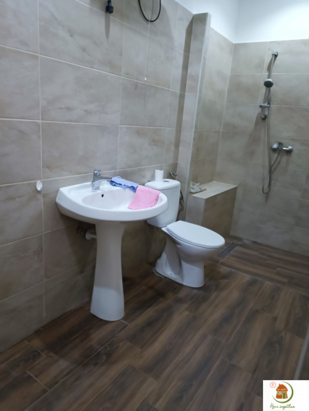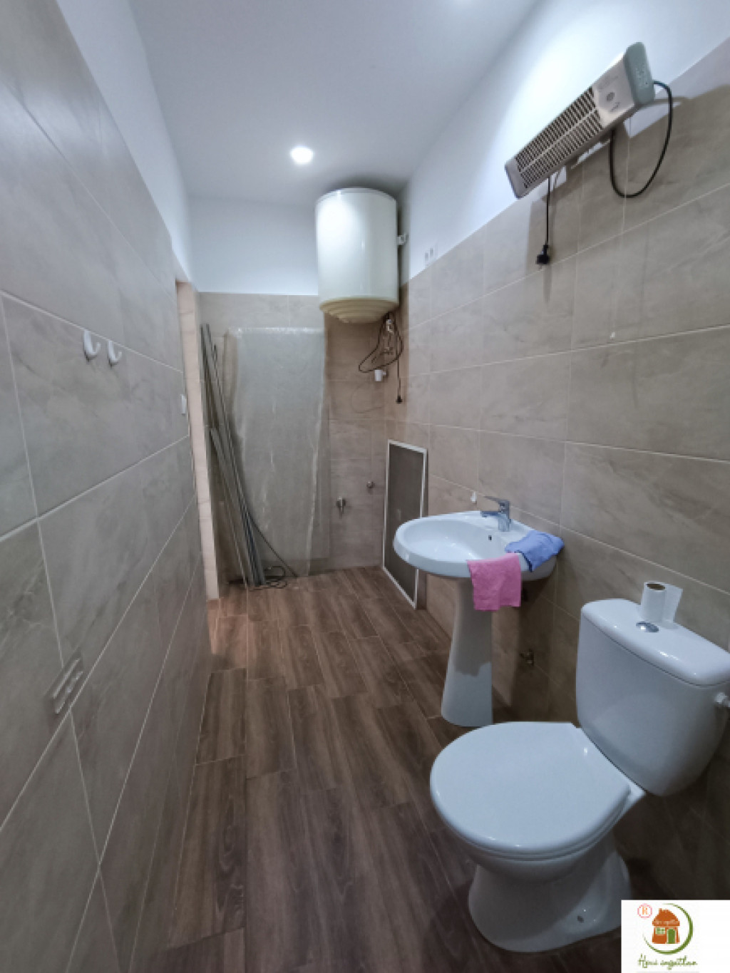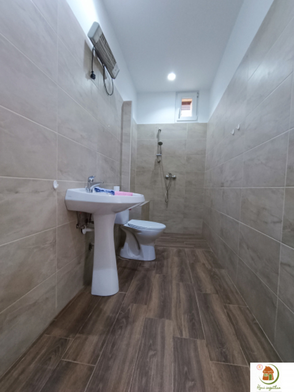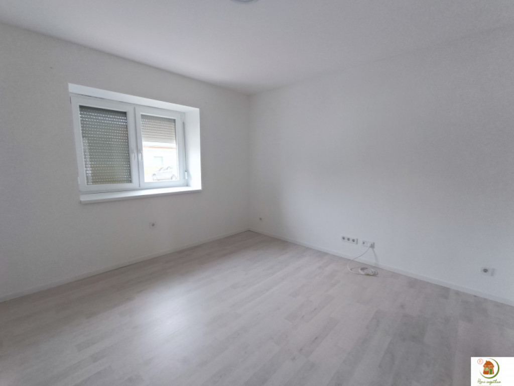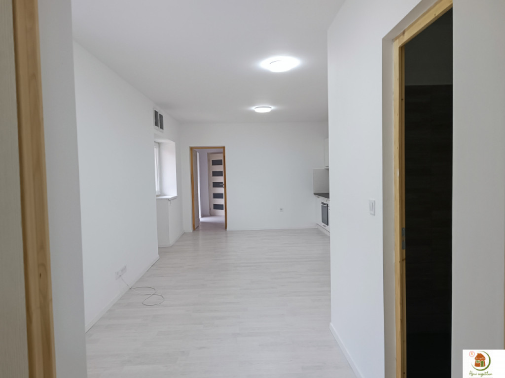Korszerű, tetszetős világítás, elegáns szürkésfehér laminált parketta, törtfehér színű falak.
