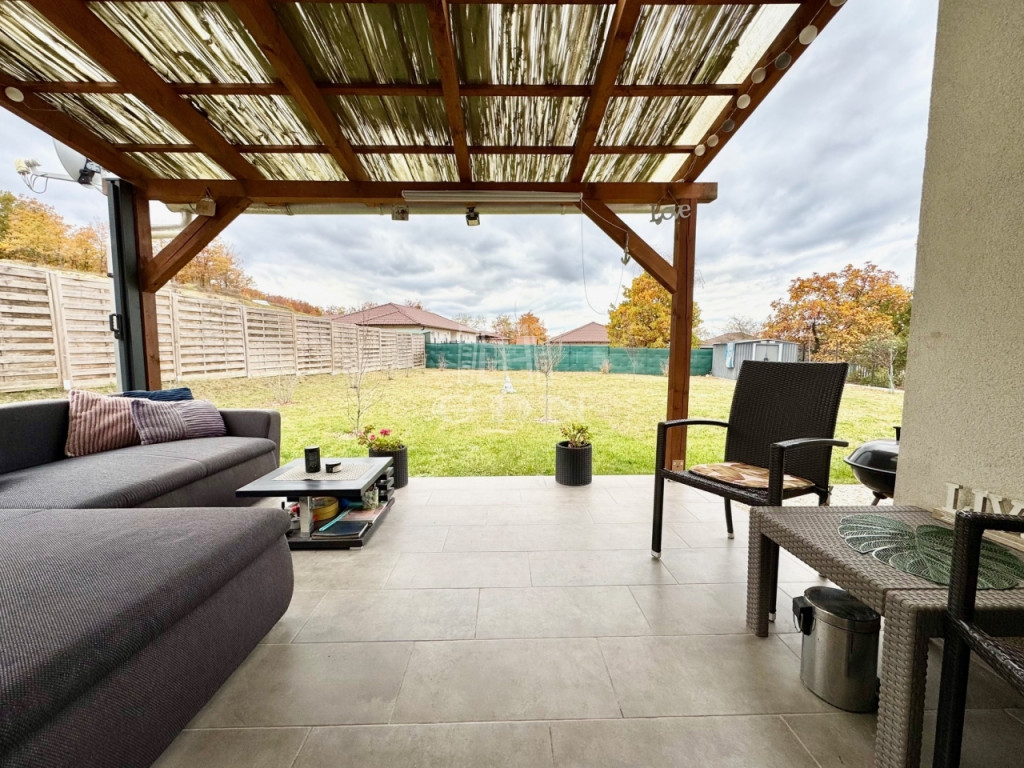 Budapest és Esztergom között a pilisi hegyek ölelésében található hangulatos településen, Pilisjászfalun újonnan, a Somlyó völgyi lakóparkban, csendes jelenleg még murvával borított összközműves mellékutcában, 800 nm-es saját kerttel rendelkező, 2020-ban épült, szigetelt, egyszintes, 71 nm-es lakóterületű, nappali + 3 háló szobás, amerikai konyhás, kamrás, közvetlen kert-teraszkapcsolatos, kiváló elosztású, külön nyíló szobás, napos-világos D-NY-i fekvésű, alacsony fenntartású, modern, kondenzációs gázkazán fűtésű, újszerű állapotú, klimatizált, riasztórendszerrel felszerelt ikerház fél, beépített, gépesített konyhával, 2 gépkocsi számára alkalmas felszíni gépkocsi beállóval, 8 nm-es kerti tárolóval, gondozott kerttel, eladó.