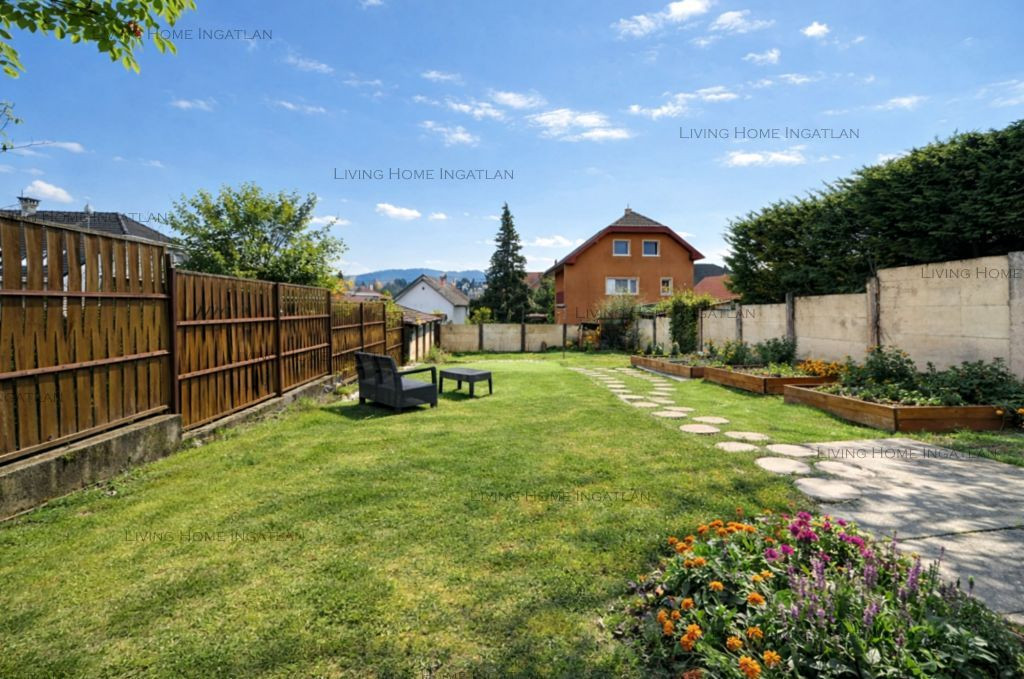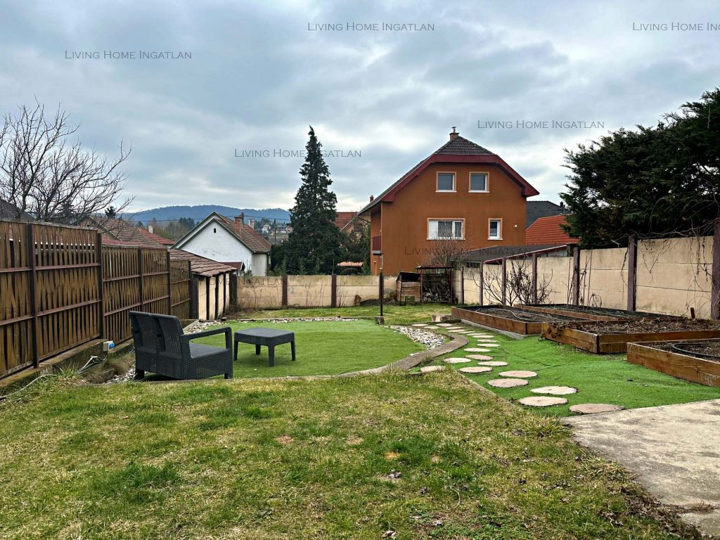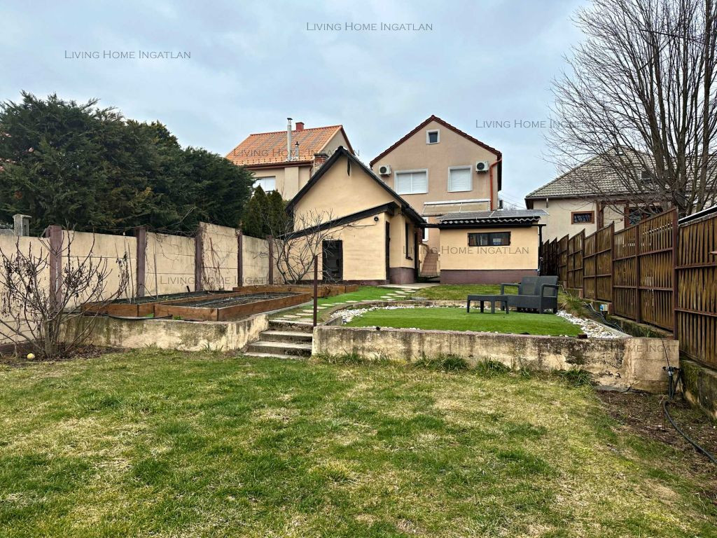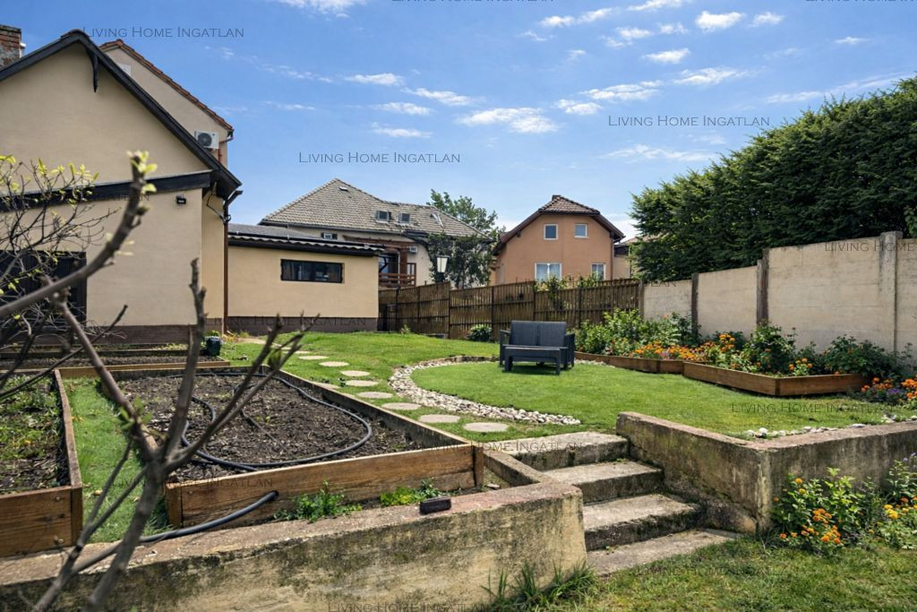 A teljes kertben öntözőrendszer, magaságyások, gyümölcsfák (cseresznye, alma, füge, áfonya, szeder). A hátsó részen intim pihenőkert grillezővel, kerti medencének kialakított terület.