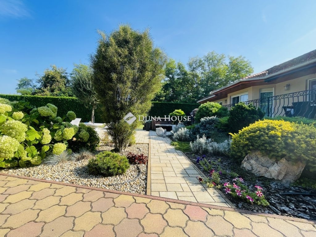 Az ingatlan egy tágas telek hátsó részén helyezkedik el, amely egy térkövezett úton közelíthető meg. A házat gondosan karbantartott, parkosított kert öleli körül, dísznövényekkel és szakember által ápolt gyep felülettel.