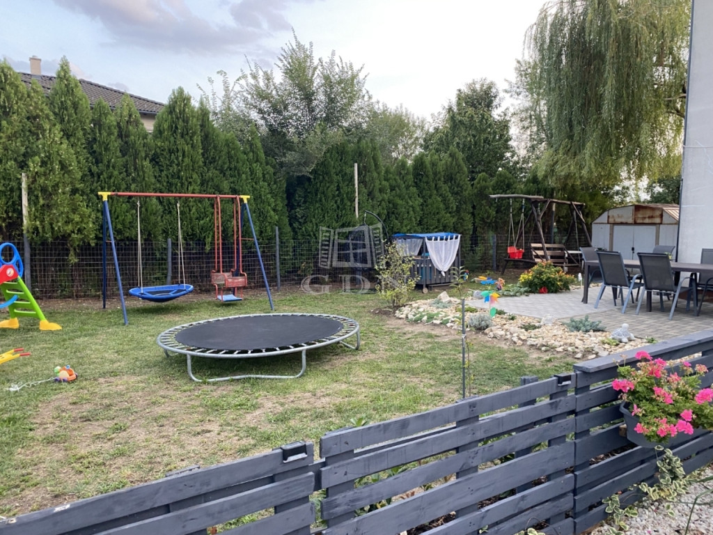 A telekterület 420m2, teljesen önálló, körbekerített és füvesített, térkövezett része alkalmas autóbeállónak.
