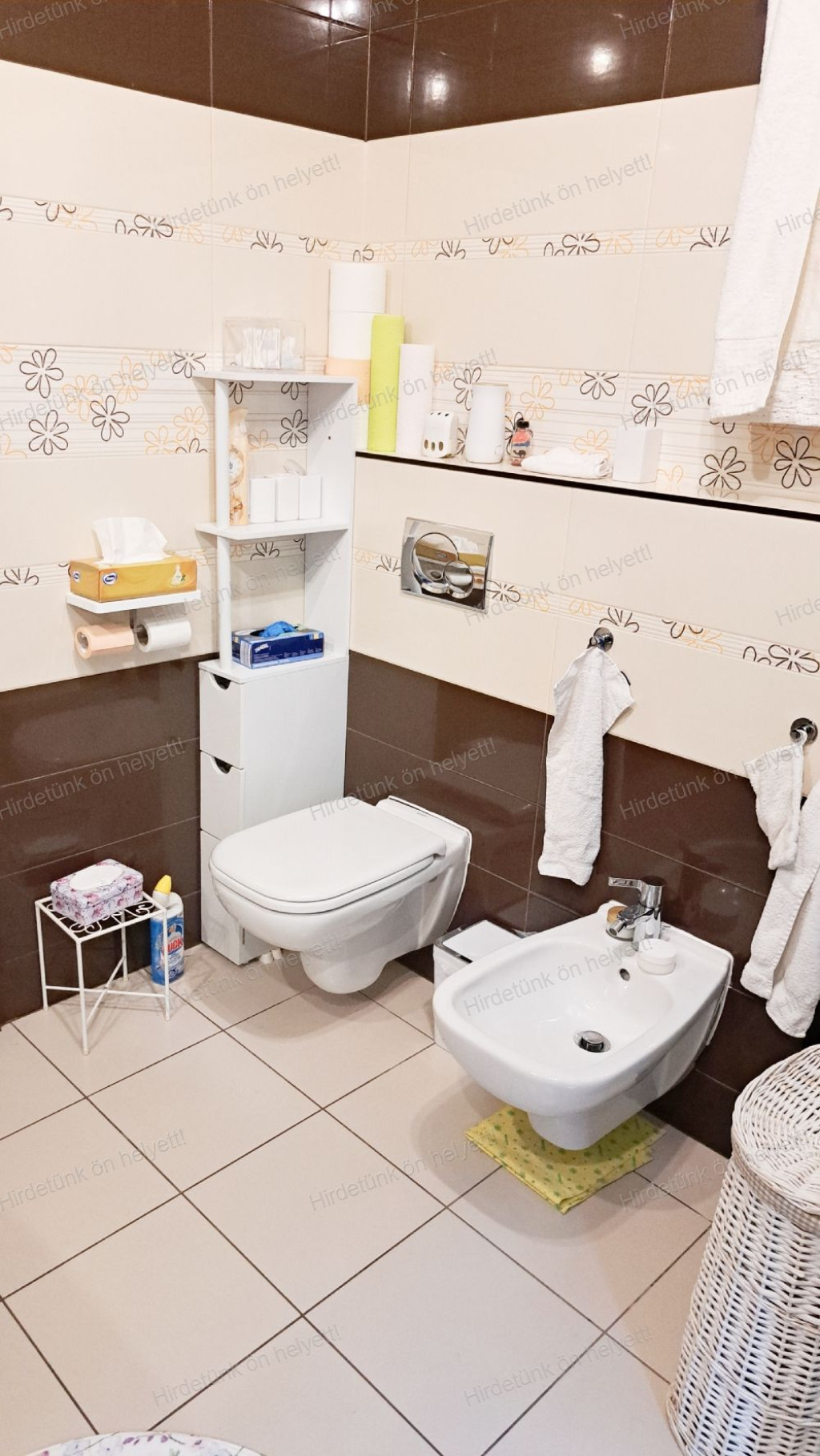 A konyhában a valódi fából készült beépített szekrénysorban, jó minőségű AEG gépek (mikró, sütő, Indukciós főzőlap, páraelszívó, mosogatógép) találhatók, mellette ablakos kamra kapott helyet.