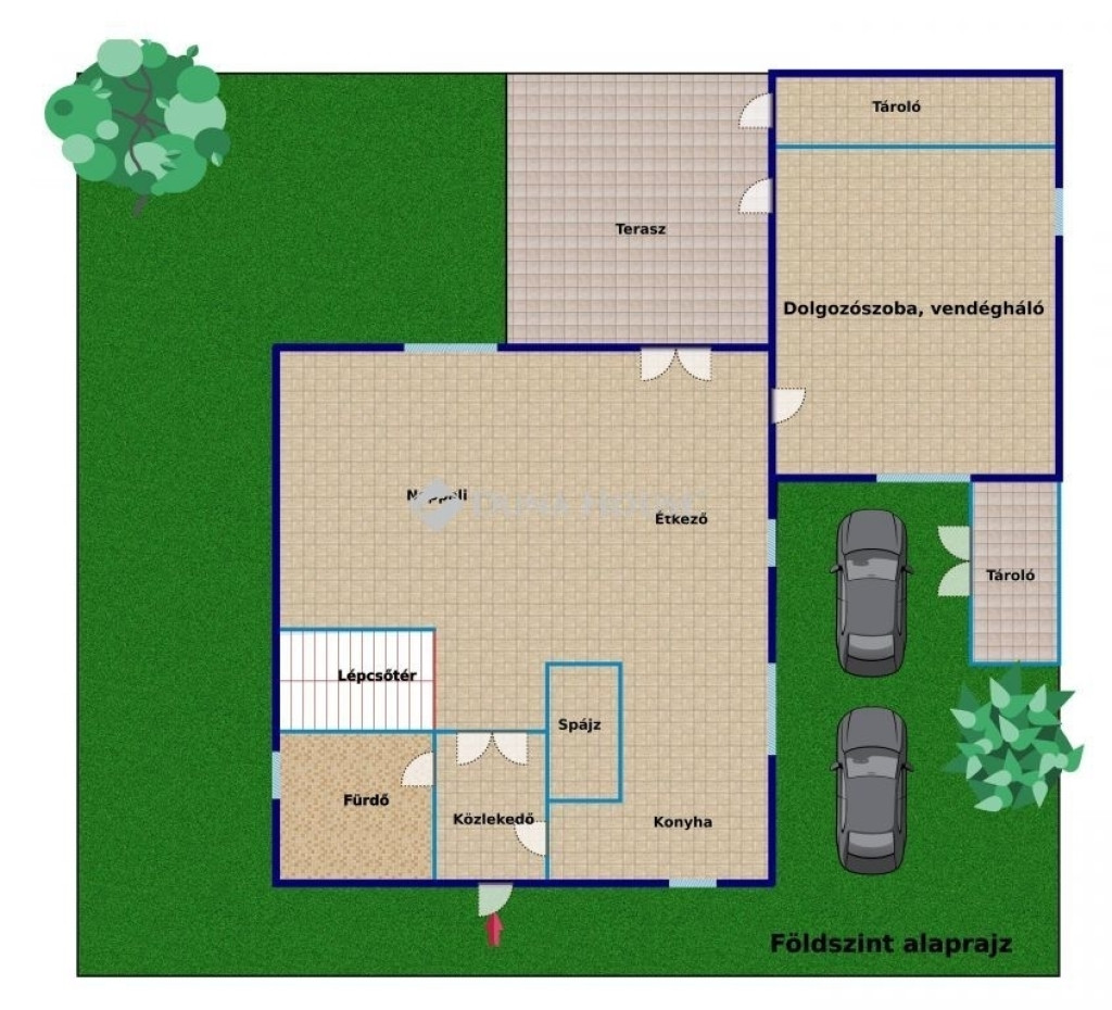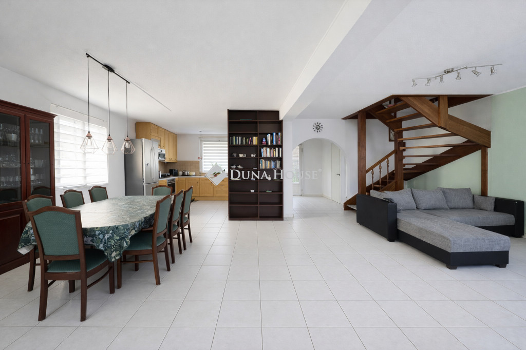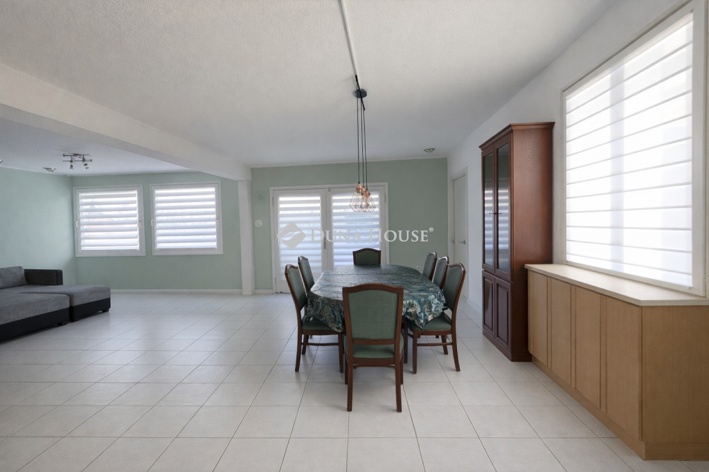Az alsó szinten tágas nappali, ebédlő, amerikai konyha és az egyik fürdőszoba van, mely 2 és fél éve lett felújítva, zuhanykabinos. A nappaliból nyílik egy nagy szoba, melyet eredetileg garázsnak szántak, de végül lakószobaként épült meg, kijárattal a teraszra. Fűtéssel, padlószőnyeggel rendelkezik. Dolgozószobaként és hálószobaként is használható.