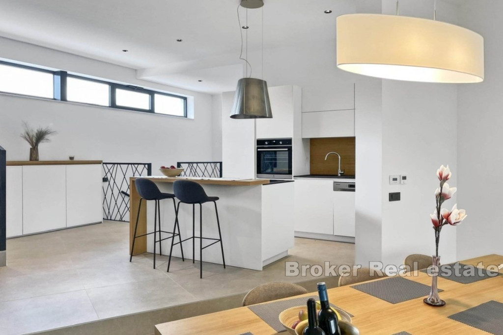 Luxurious modern villa located in a quiet location, 9 km from the coast and 12 km from the city of Poreč. It is located on a plot of 1450 m2, of which 306 m2 is residential. It consists of a basement, ground floor and first floor, i.e. four bedrooms and a total of six bathrooms. Wellness with sauna, jacuzzi and gym is located in the basement of the villa. On the ground floor there is a spacious living room with access to the terrace, a kitchen with a dining room, one bedroom with a bathroom and a toilet. Upstairs are the remaining three bedrooms, each with a separate bathroom, access to the terrace and a panoramic view of the forest and greenery. There is a large heated swimming pool of 50 m2 and a summer kitchen in the garden with a soothing view of the greenery. The villa is an excellent choice for anyone looking for a quality vacation and a great investment for tourist rental. BROKER REFERENCE ID:1014/31