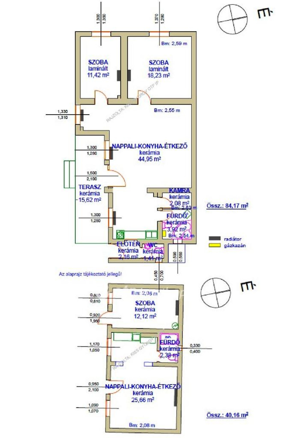 Helyiségek: Főépület: 2 szoba, nappali-konyha-étkező, kamra, fürdőszoba-WC (egyben), előtér, WC, kazánház, tárolók. Hátsó épület: nappali-konyha, szoba, fürdő (WC-vel együtt).