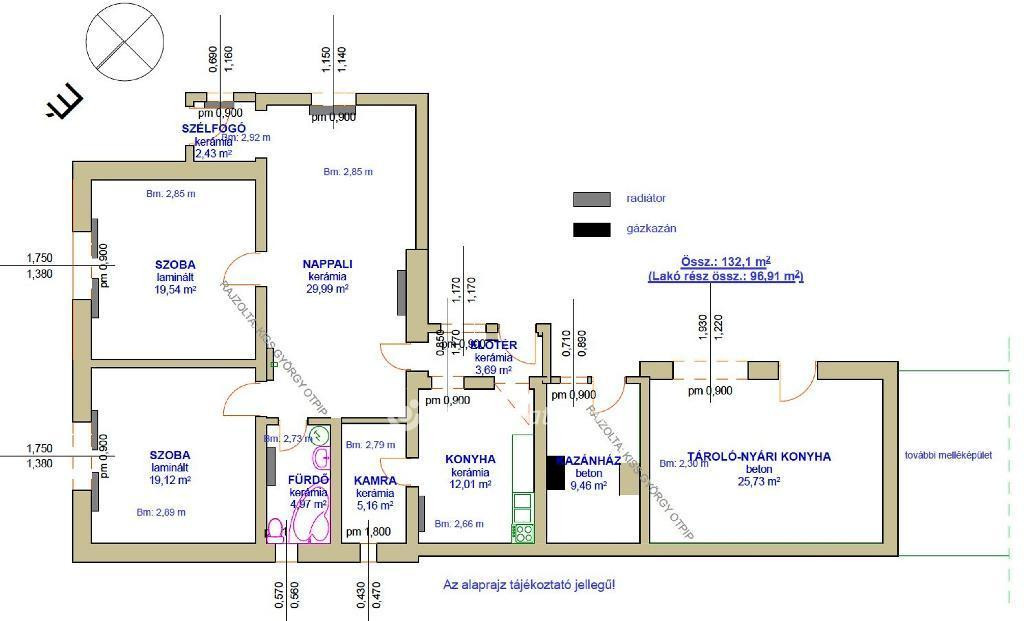 Helyiségek: 2 szoba, nappali, konyha-étkező, kamra, fürdőszoba-WC (egyben), előtér, szélfogó, kazánház, tárolók.