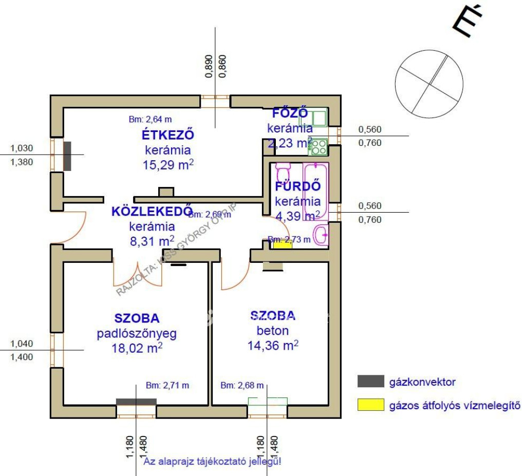 Helyiségek: 2 szoba, közlekedő, étkező, főző, fürdő.