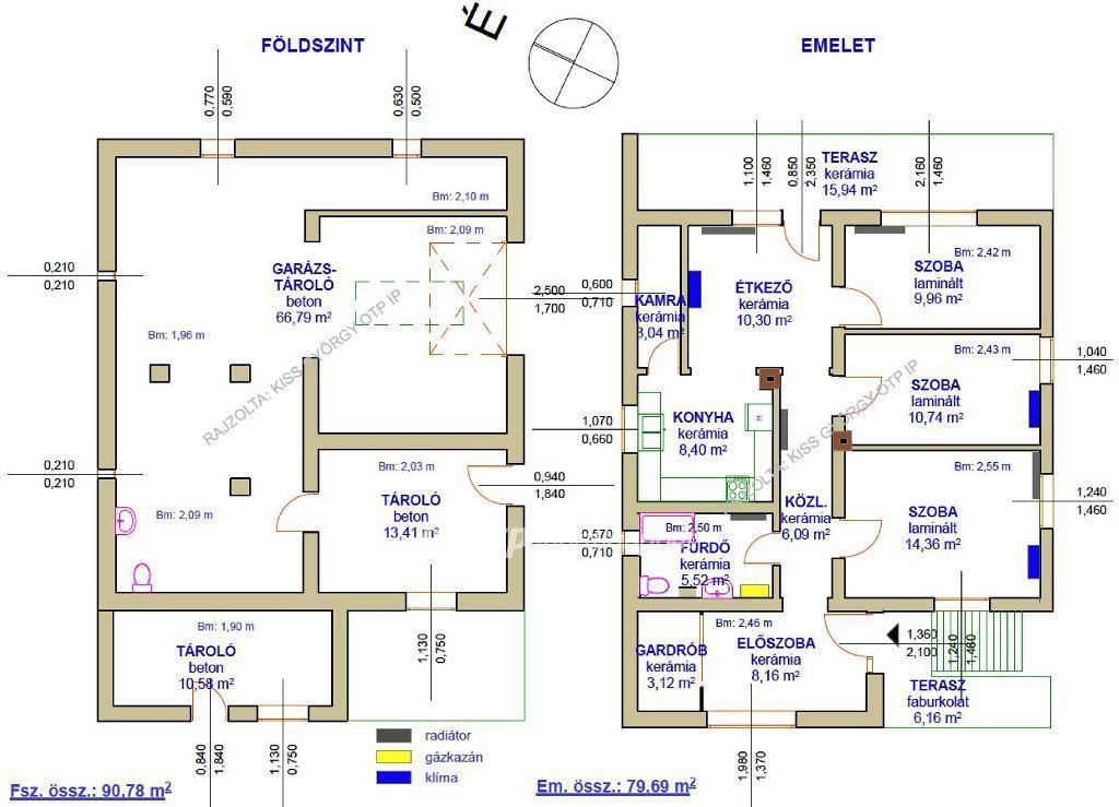 Helyiségek: földszint: garázs-tároló (WC-vel kézmosóval), 2 tároló (fsz. össz: 90,78 m2); emelet: konyha, étkező, 2 félszoba, szoba, fürdő (WC-vel), előszoba, gardrób, közlekedő, kamra, 2 fedett terasz (em. össz: 79,69 m2).