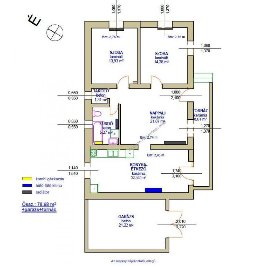 Helyiségek: 2 szoba, nappali, konyha-étkező, fürdő (WC-vel), tároló, tornác, garázs (21,22 m2).
