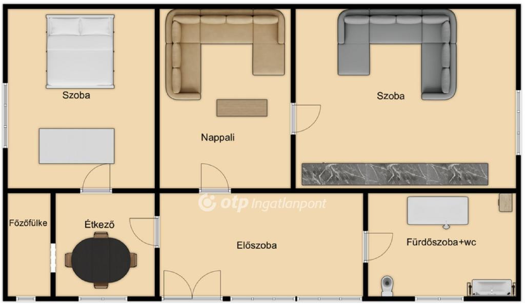 -a világos beltérben minden helyiség külön nyílik: előszoba , 2 szoba , nappali , főzőfülke , étkező , fürdőszoba+wc található.