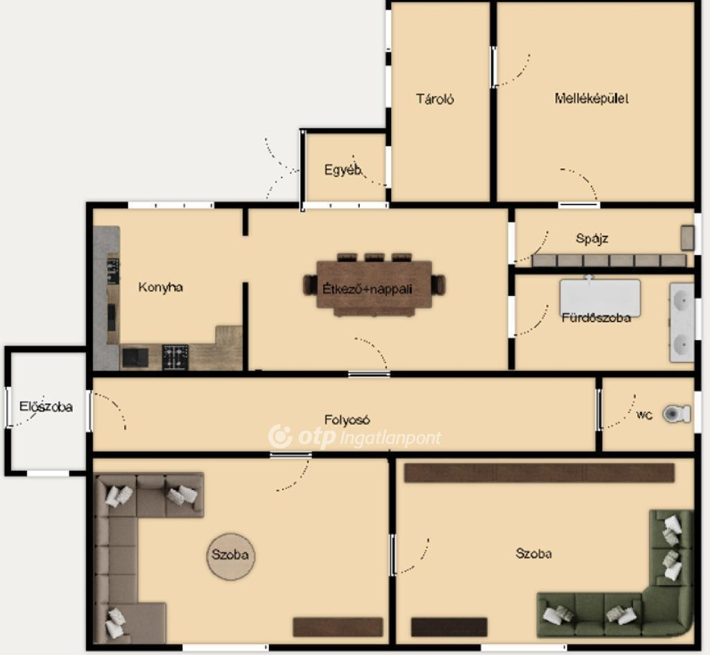 -kedvező fekvésének köszönhetően a világos beltérben : előszoba , 2 szoba , nappali+étkező , konyha , folyosó , spájz , fürdőszoba , és külön wc található.
