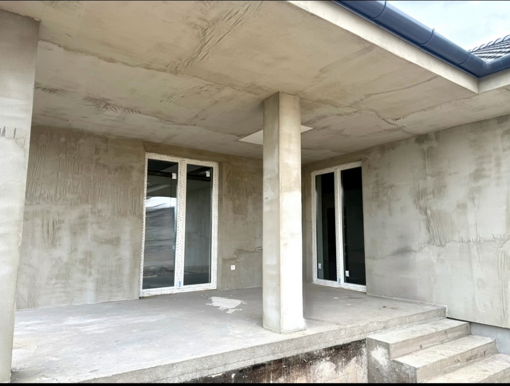 Helyiségei : előtér, 34 m2-es nappali - terasz kapcsolattal, 21 m2-es konyha+étkező - szintén terasz kapcsolattal, 3 hálószoba, zuhanyzós fürdőszoba wc-vel, háztartási helyiség wc-vel, 15 m2-es fedett terasz. A bejáratnál egy fedett előterasz fogad minket.