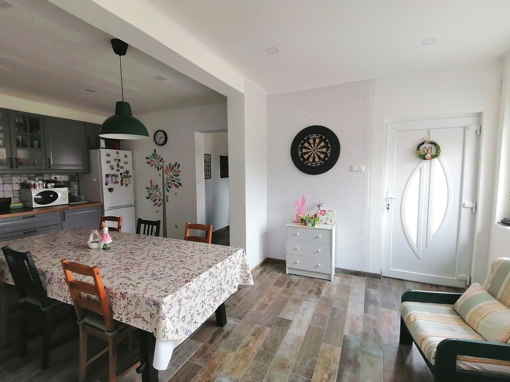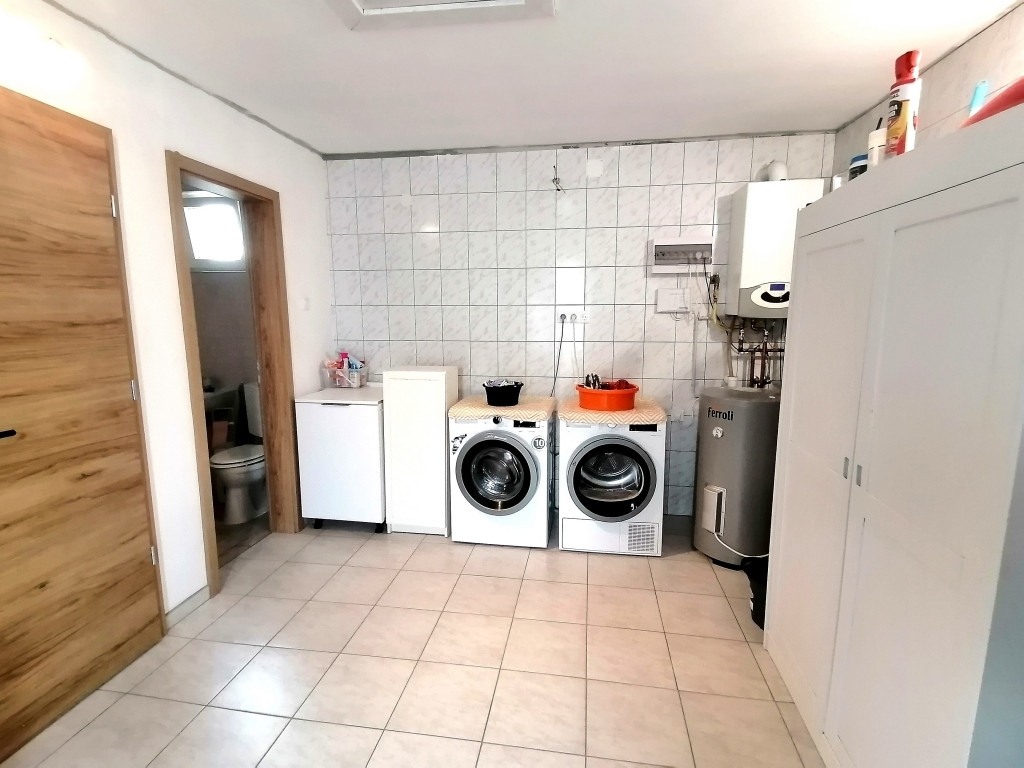 előtér, tágas étkező, konyha, nappali, 3 hálószoba, 2 zuhanyzós fürdőszoba, külön wc, tágas mosókonyha-kazánház. A ház 2 bejárattal rendelkezik.