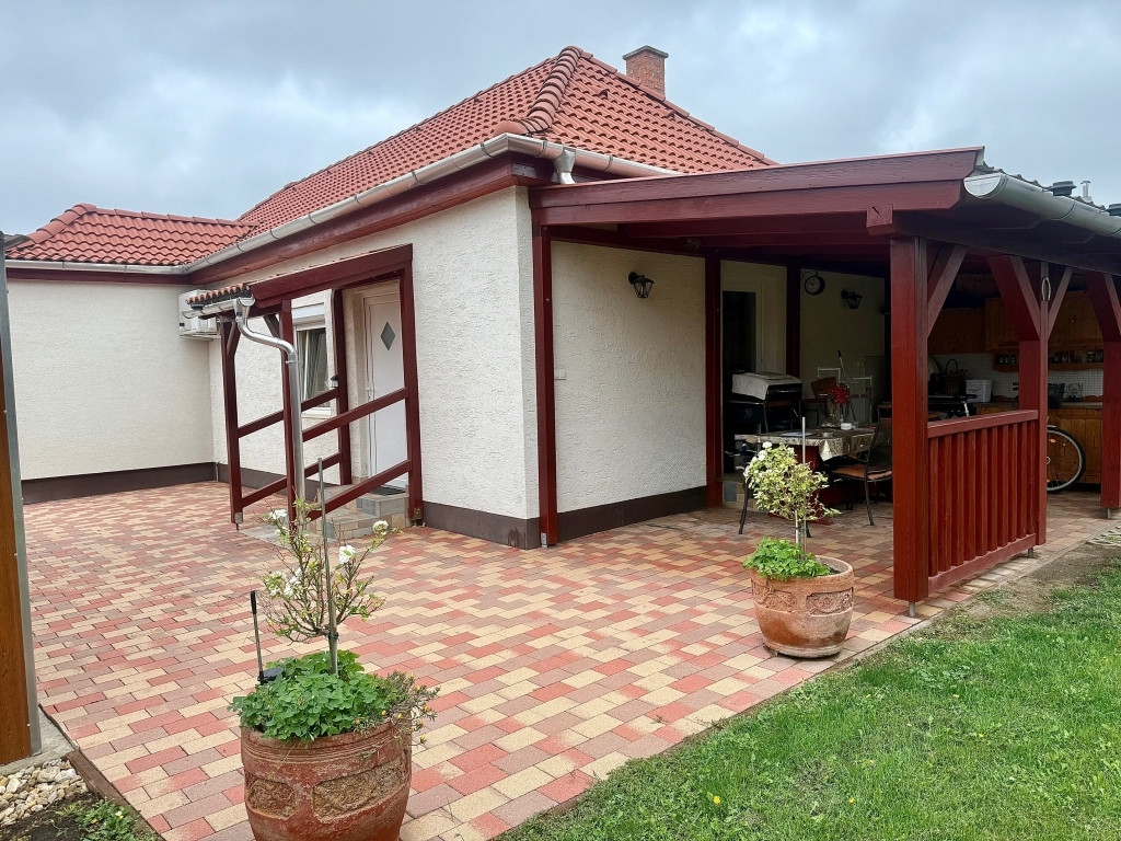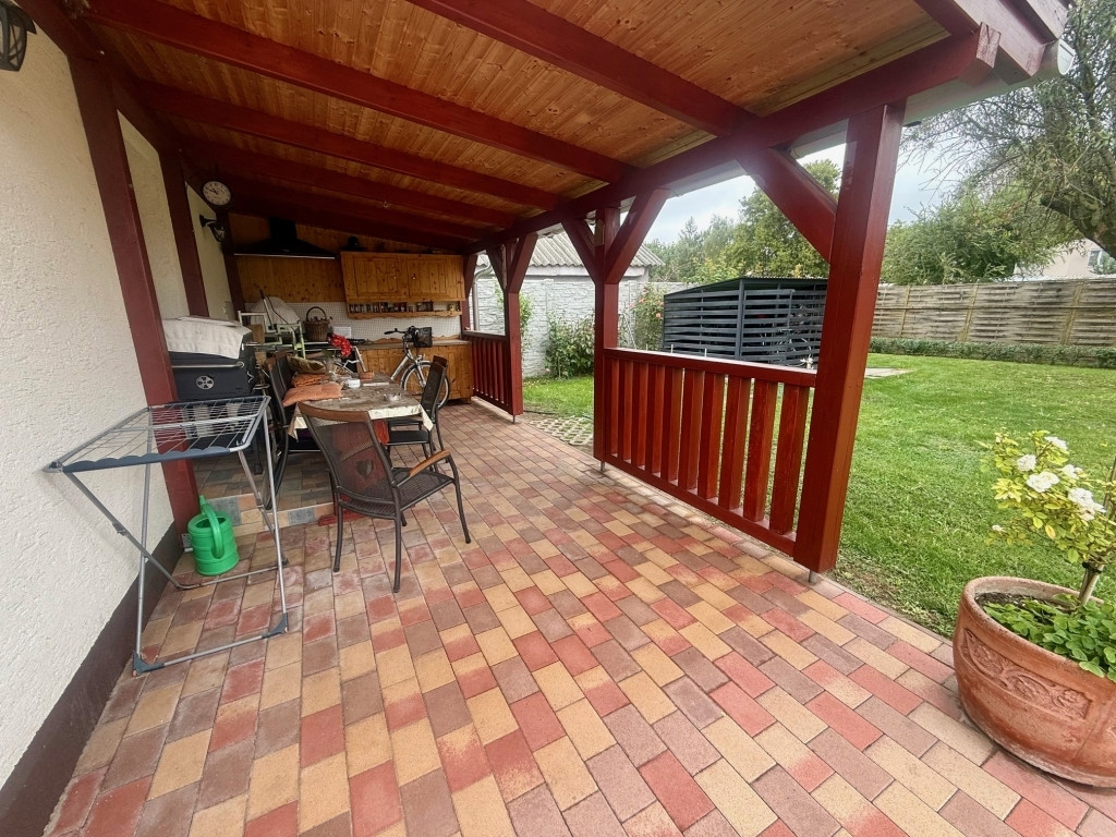 előszoba, közlekedő, konyha+étkező új beépített és gépesített konyhabútorral, fürdőszoba épített zuhanyzóval, nappali, 2 hálószoba (21 és 10,5 m2). Az udvar felől található hálószoba terasz kapcsolatos. A fedett terasz konyhával is fel van szerelve!