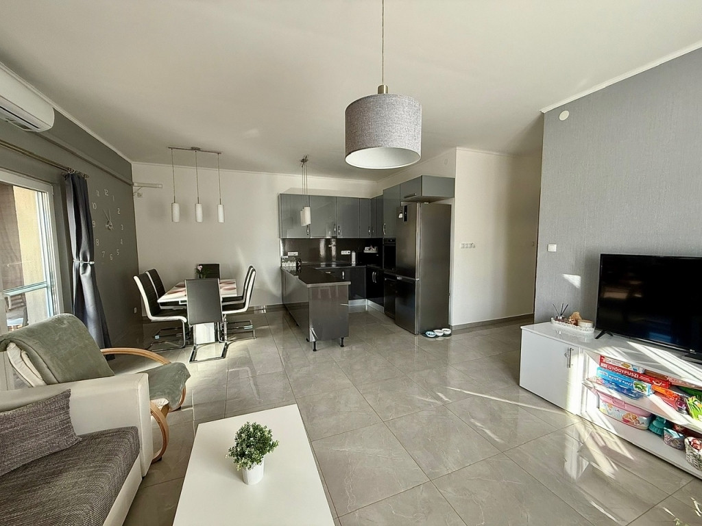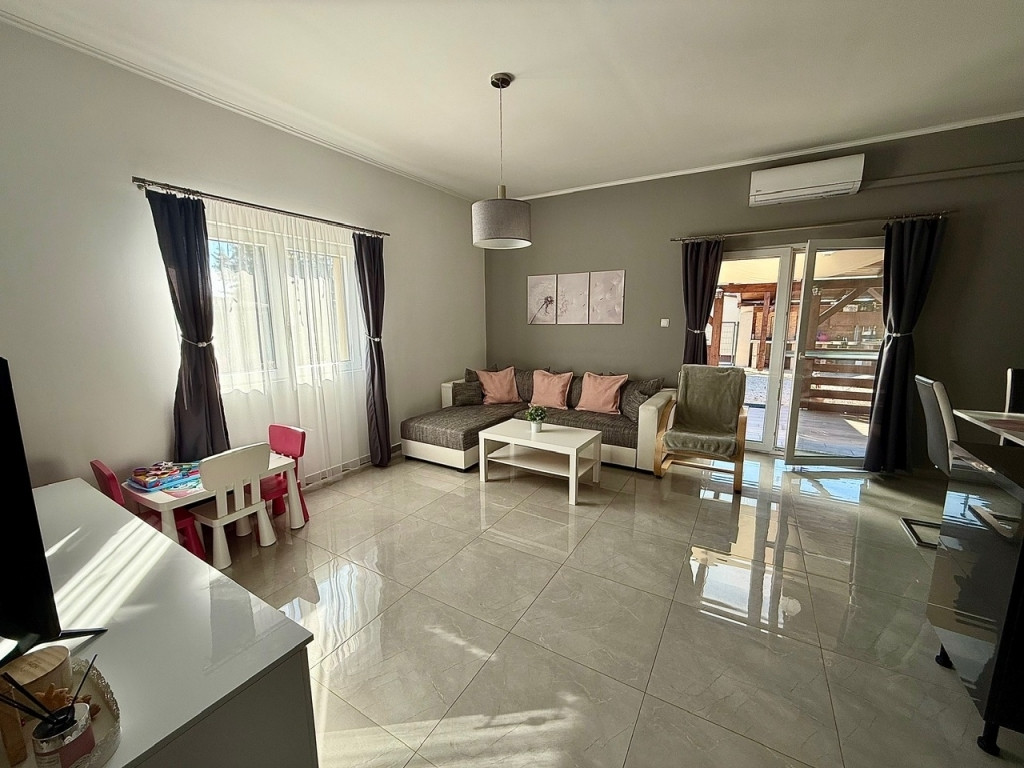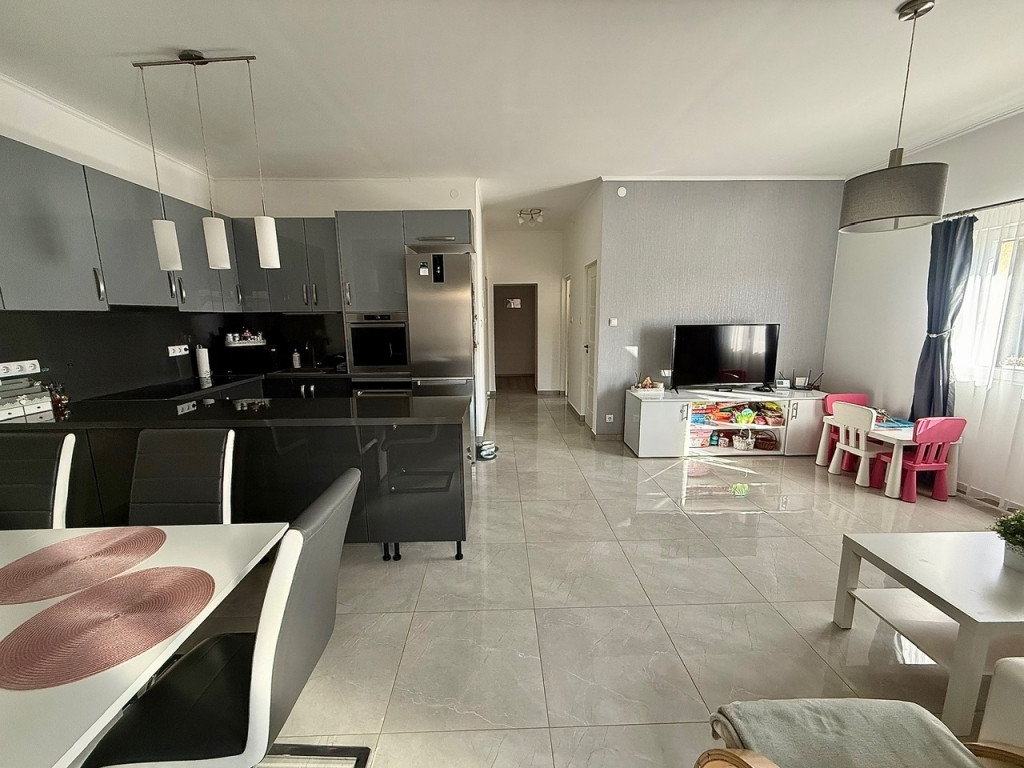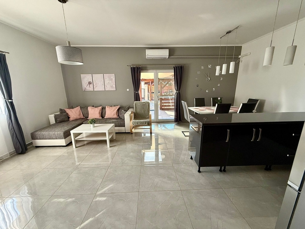 Helyiségei : előszoba, közlekedő, 2 hálószoba, fürdőszoba, külön wc, gardrób, amerikai konyhás nappali beépített és gépesített konyhabútorral étkezővel, 21 m2-es fedett terasz.