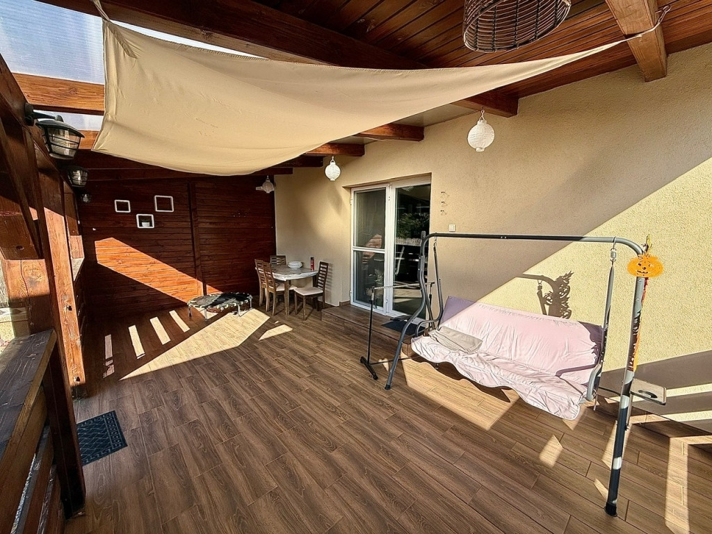 -a nappaliból nyíló fedett terasz famintás járólappal burkolt, és nagyon hangulatos