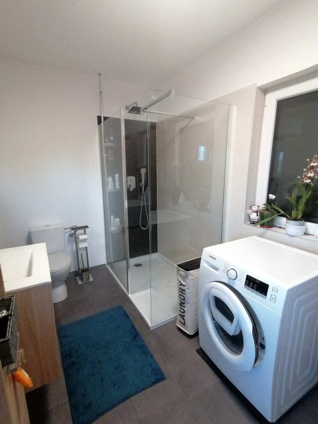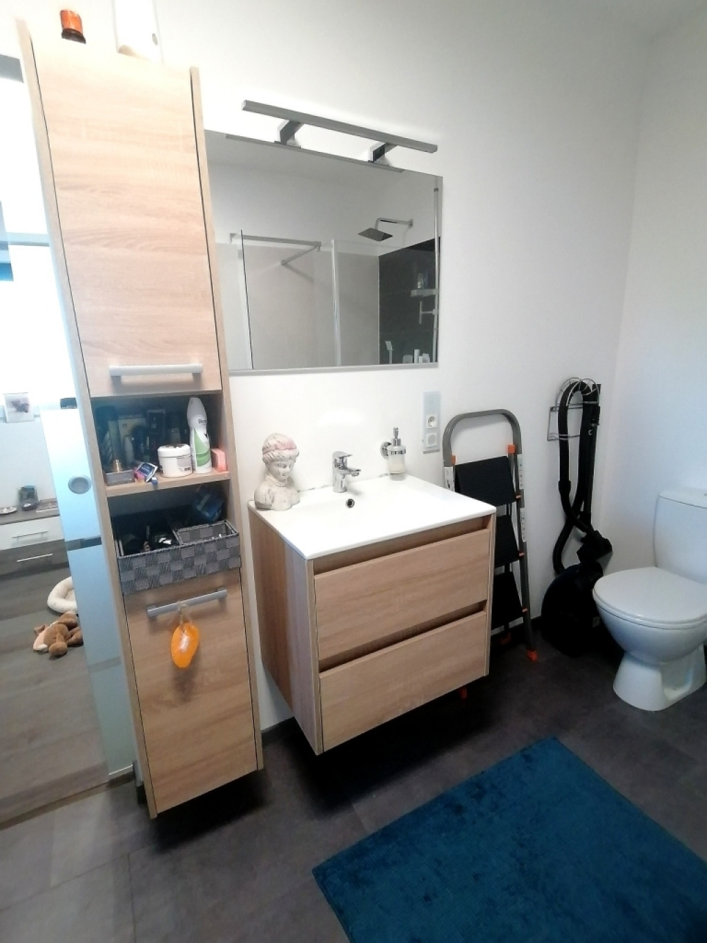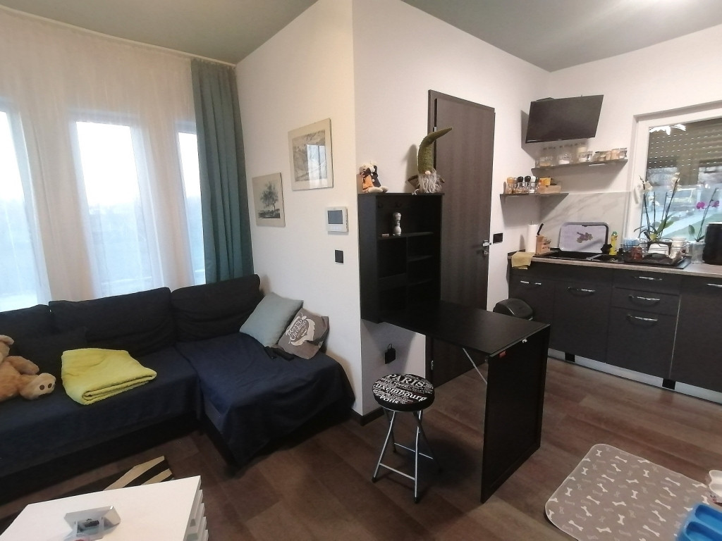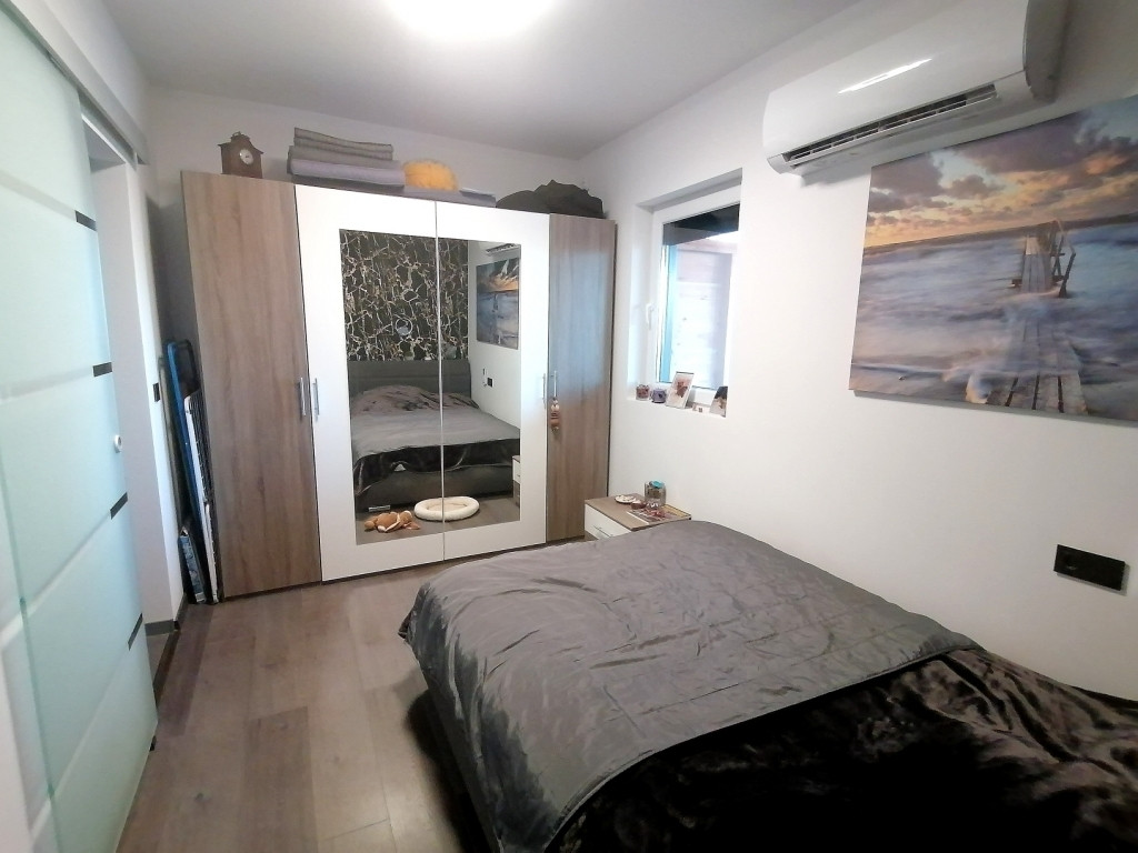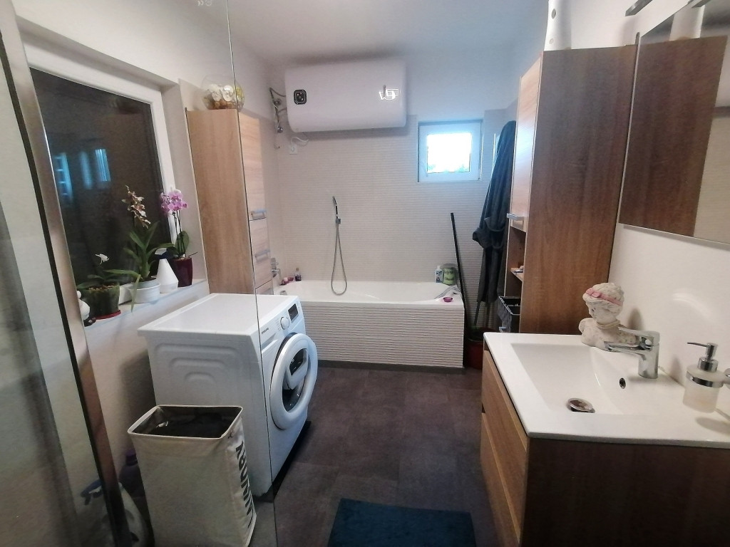 Helyiségei : előszoba, konyha+nappali egy légtérben, hálószoba, tágas fürdőszoba (kád, zuhanyzó, wc), és egy külön wc+mosdó.
