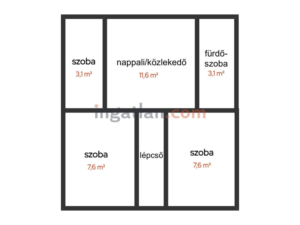 Az összesen 6 szobás ingatlan, az alsó szinten egy amerikai konyhás nappali, egy hálószoba és fürdőszoba, a felső szinten pedig egy közlekedő/nappali, 3 db hálószoba és fürdőszoba elrendezésű.