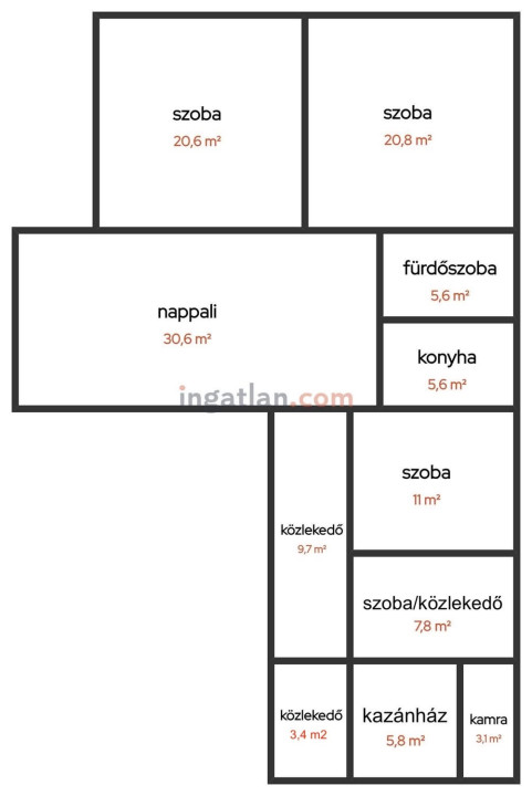 Az óriási ingatlan 4,5 szobás kialakítású. (3 szoba + 1 nappali + 0,5 szoba/közlekedő)