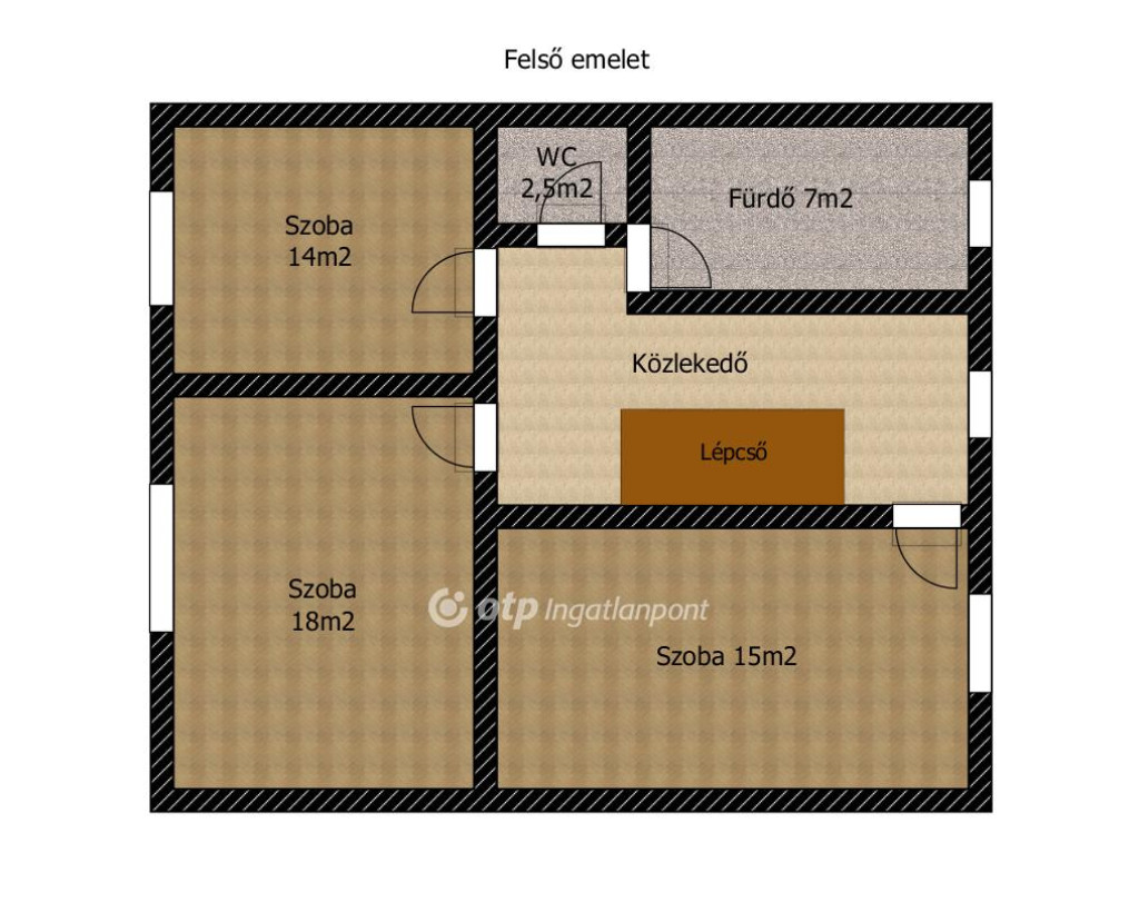 A legfelső emeleten 3 hálószoba, wc, kádas fürdőszoba és egy közlekedő található.