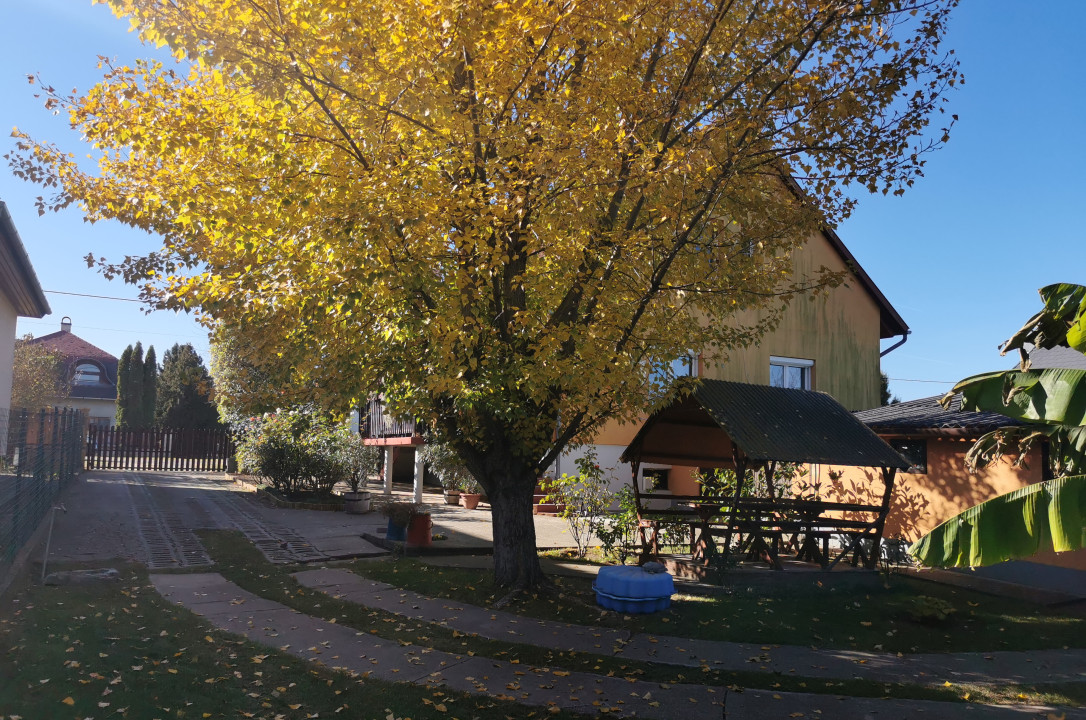Udvar: előkertben rózsabokrok, 6 személyes kisméretű pavilon, 2 db nagyméretű tuja, 3 db banánfa,