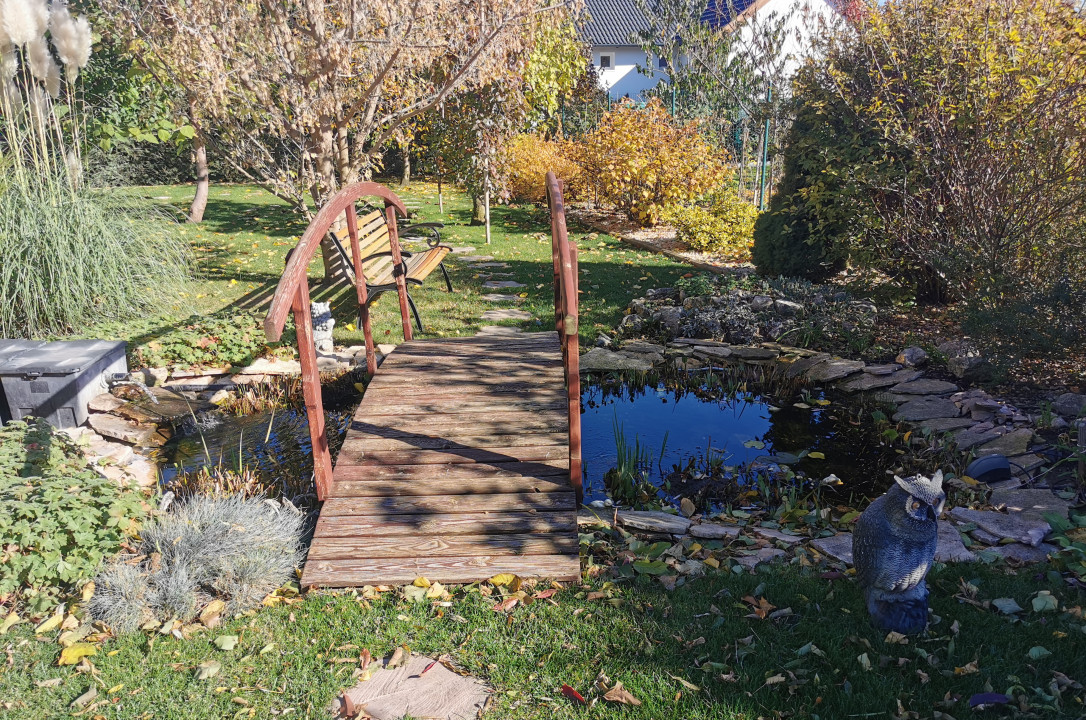gyümölcs cserjék, kb 8 m3-es halastó híddal, gyümölcs bokrok,