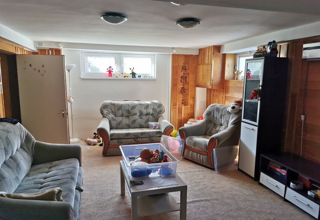 Szuterén 53 m2 - 4 db helység: 1. 34m2 padlószőnyeg borítás 2. 8,4 m2 - tároló- 3. 12 m2 (járólap borítás sarokban bárpult),