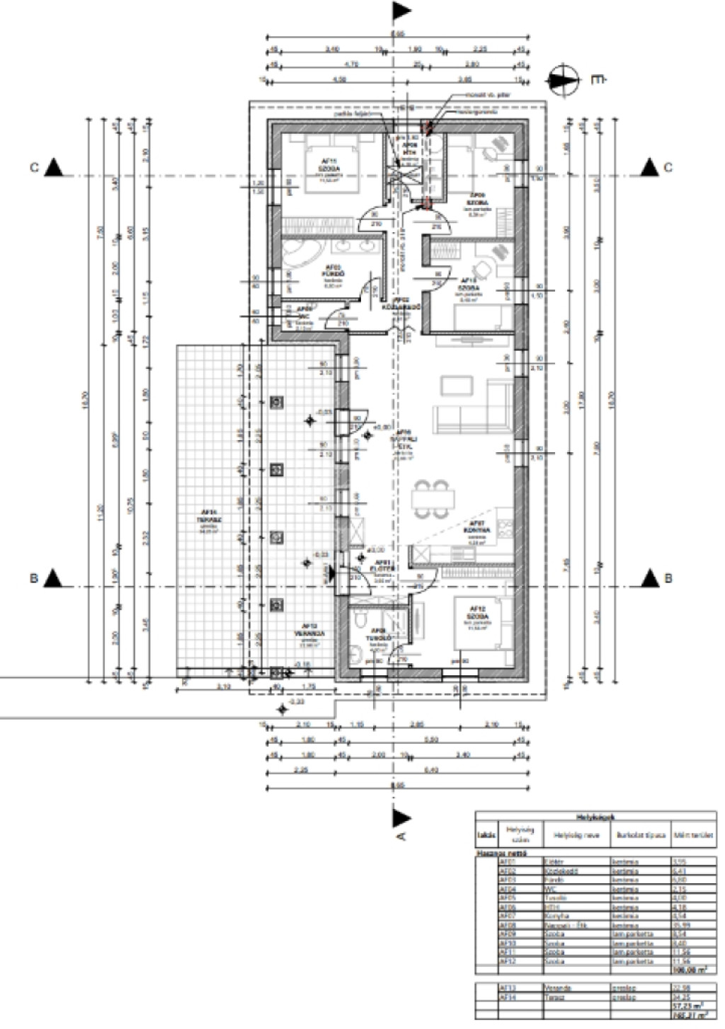 szoba 8,54 m2, szoba 11,56 m2, szoba 11,56 m2, terasz 57,23 m2.