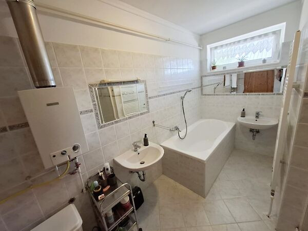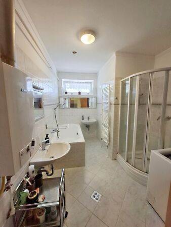 Tágas fürdőszoba fürdőkáddal és zuhanyzóval, 2 mosdóval,külön illemhelyiség.