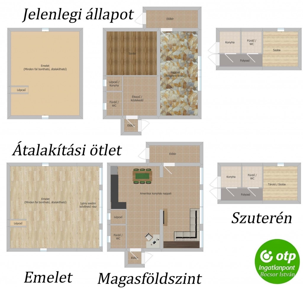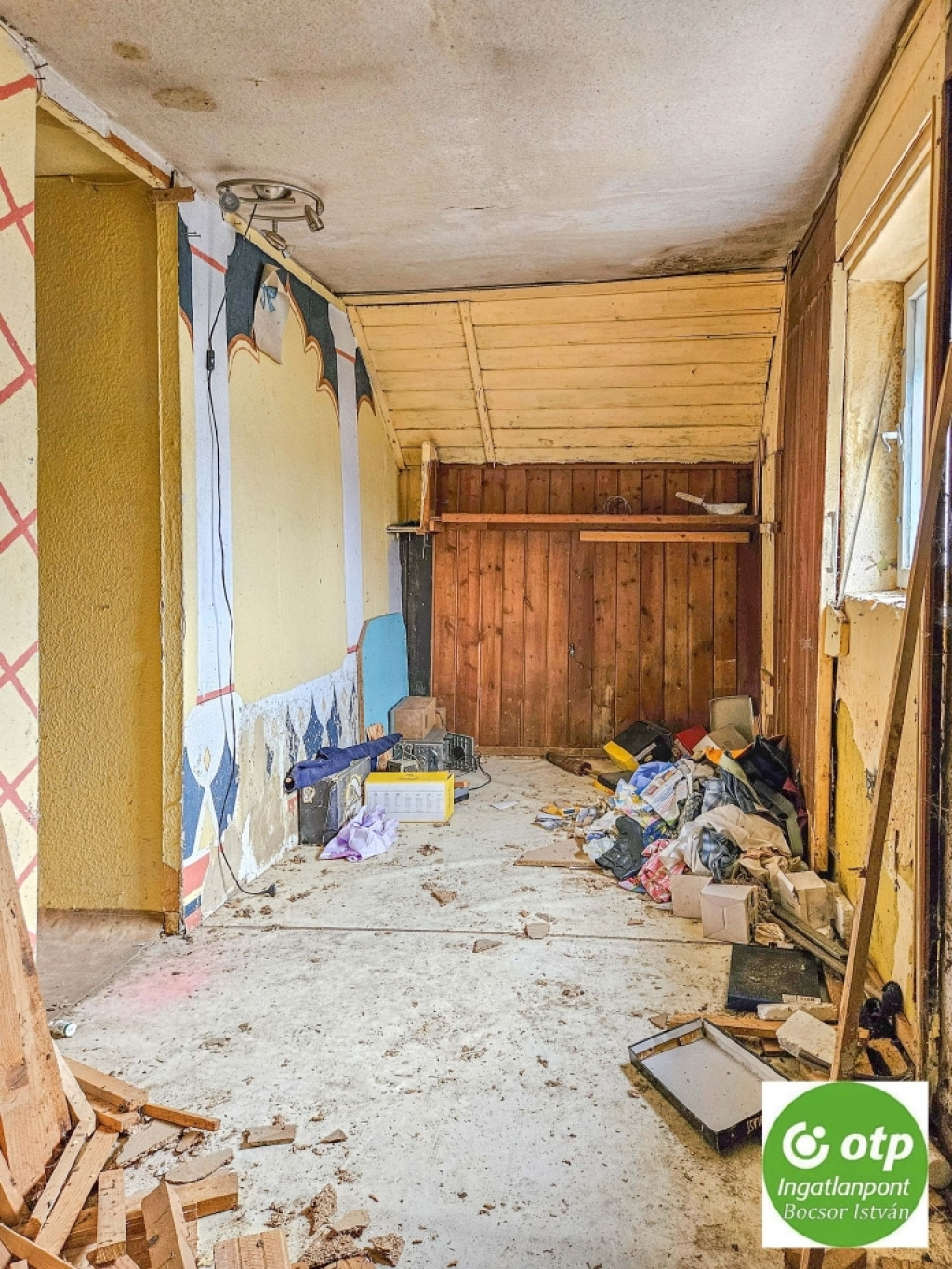 Magasföldszint: az eredeti ház ki lett bővítve. A nappali jelenleg egy könnyűszerkezettel beépített terasz. Ez újrafalazható, átalakítható.