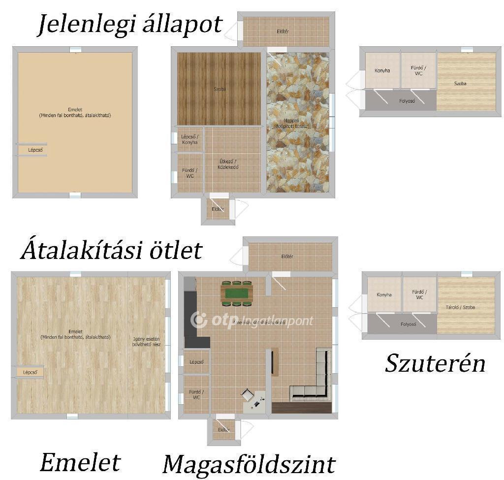 Magasföldszint: az eredeti ház ki lett bővítve. A nappali jelenleg egy könnyűszerkezettel beépített terasz. Ez újrafalazható, átalakítható.