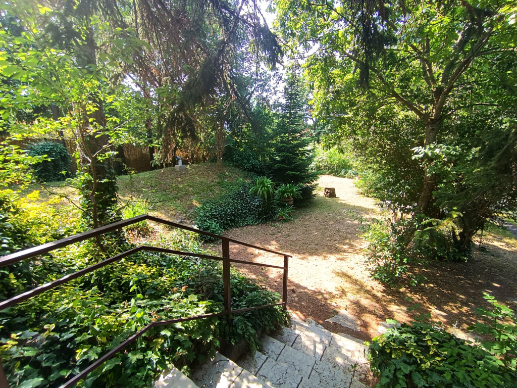 A kertben nagy fák adnak árnyékot, minden oldalról magas örökzöldek védik a házat a kíváncsiskodó tekintetektől. Egy kis földi pince is van itt, amely nyáron is hűvös, tökéletes klímát teremtve a tárolandó boroknak. Az épület mögött egy kis szerszámtároló áll. Garázs nincsen, de a feljárón 3 személyautó kényelmesen elfér.