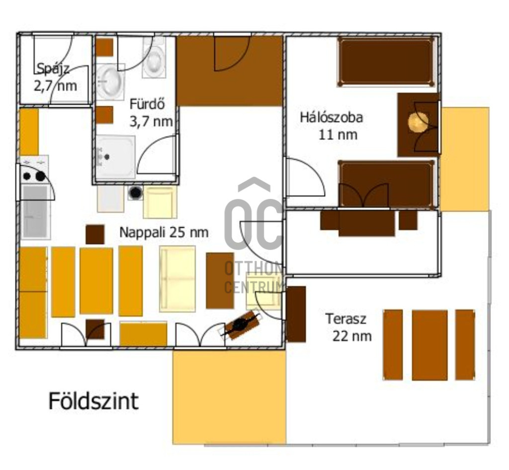 Két szinten, összesen 89 nm nettó területen van elosztva a nagy közösségi tér (nappali-étkező-konyha), egy hálószoba, egy fürdőszoba és egy spejz a földszinten, ahová nagy teraszon keresztül juthatunk. Az emeleten két nagy hálószoba, fürdőszoba és egy pakolós helyiség kapott helyet.