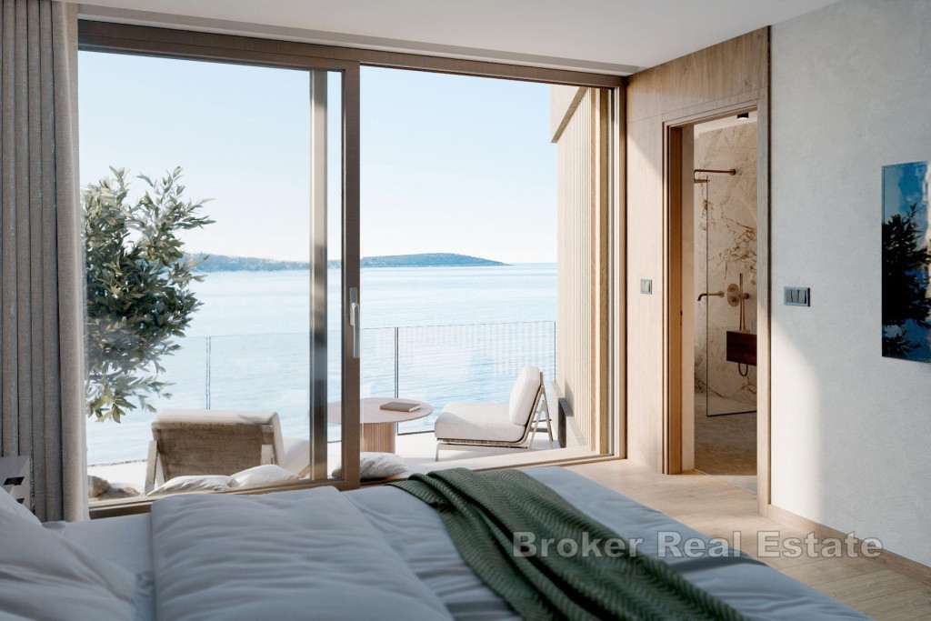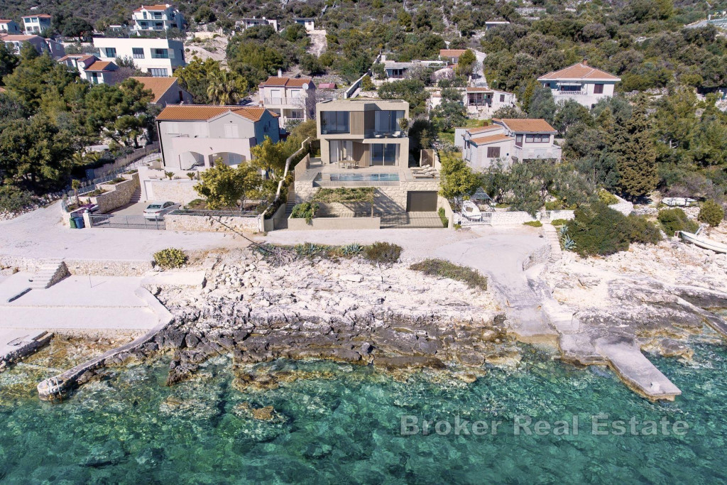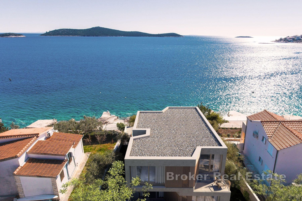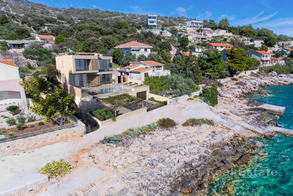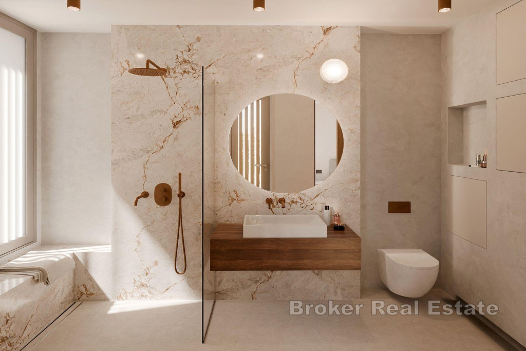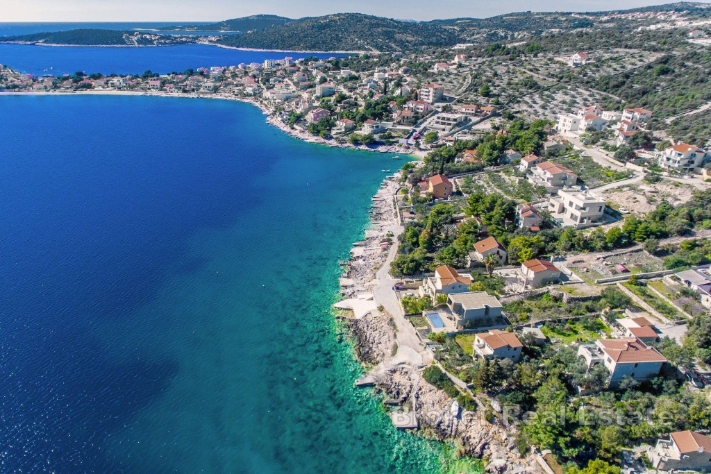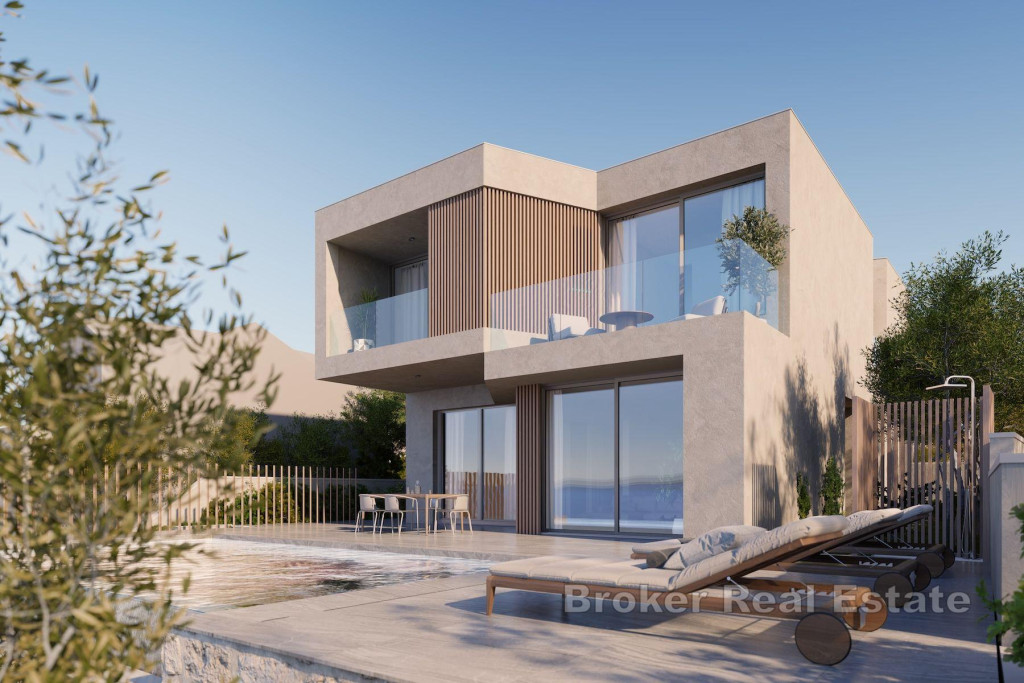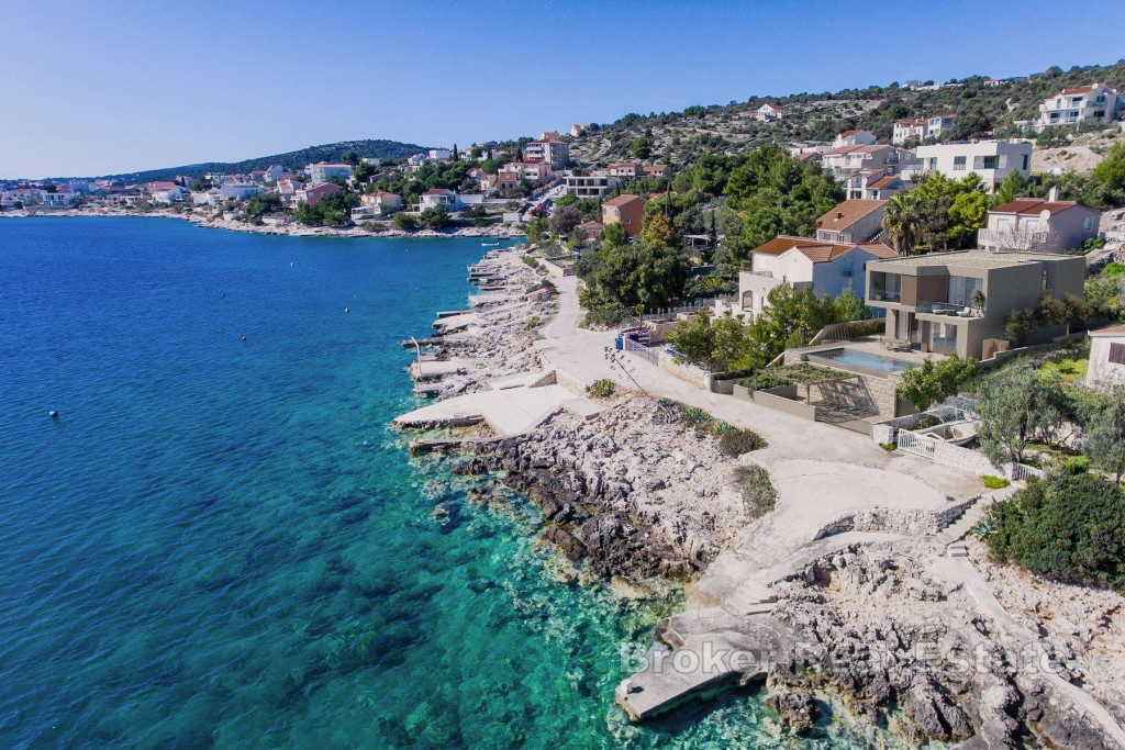 This extremely attractive villa is located in the beautiful small tourist town of Sevid, near Rogoznica and Trogir. The villa is currently under construction, and the project is expected to be completed in the first half of 2026. It represents a rarity and an exceptional opportunity on the market of luxury residential holiday properties on the Croatian coast. It was designed according to the highest standards of contemporary architecture, with an emphasis on construction quality, functionality and aesthetics. Only top-quality materials and equipment from renowned manufacturers are used in the construction and furnishing. The total living area of the villa is 350 m², and it is spread over three floors: basement, ground floor and first floor. The villa has five spacious bedrooms, each with its own bathroom. The basement houses a garage, engine room, compensation pool, sauna, fitness room, bathroom, technical room and laundry room. The basement floor plan can be adapted to the buyer’s wishes. The ground floor includes a modern kitchen, a guest toilet, one bedroom with an en-suite bathroom and a dressing room, and a spacious living room with a dining area. The living area opens onto a spacious terrace with a heated infinity pool and a beautiful panoramic sea view. The bedroom on the ground floor has access to a well-kept garden on the north side, while the kitchen leads to an outdoor area with a barbecue. On the first floor there are four elegantly decorated bedrooms, each with a private bathroom and access to a balcony or terrace. The master bedroom on the south side also has its own walk-in wardrobe. The villa is equipped with an underfloor heating system, a heat pump for water heating and a multi-split air conditioning system with indoor units discreetly built into the suspended ceiling. The garden is carefully landscaped with Mediterranean plants, equipped with an automatic irrigation system, a sunbathing area, parking for four vehicles (two of which are covered under a pergola), and a garage for at least one vehicle. The entire property is fenced and equipped with automatic electric gates. A special value for this property is its microlocation – it is located at the end of a dead-end street, which ensures peace, privacy and relaxation in the immediate vicinity of the sea, away from the city bustle. A mooring for a boat up to 20 meters long is planned in front of the property. The distance to Rogoznica is 10 km, while Split Airport is 27 km away. BROKER REFERENCE ID:2022/400