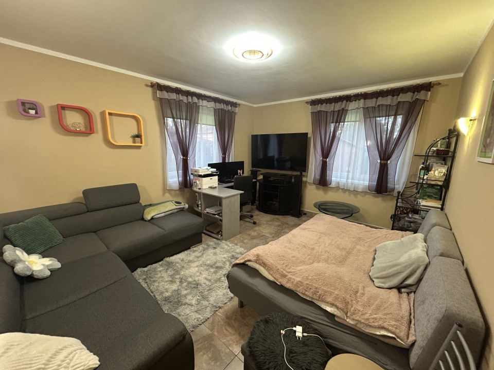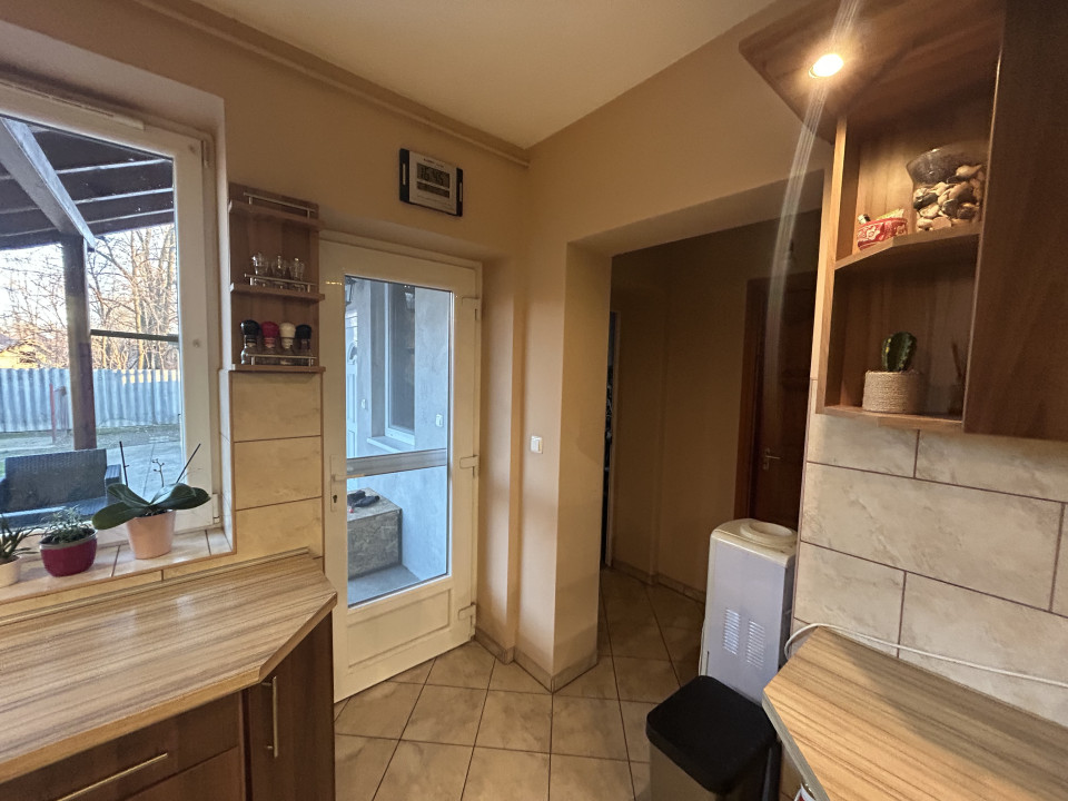 a,-1.- Az eladó ingatlan helyiségei a földszinten az udvar/kert felőli részen: bejárat, előszoba, szoba(ezen keresztül átjárás a másik részbe) étkező és konyha egy légtérben, nappali (mely az étkezőből nyílik) kamra, kazánház, gardrób, fürdő és külön helyiségben található WC. Az étkező- konyhából és a nappaliból kijárat a földszinti kb. 20 m2 területű fedett teraszra.